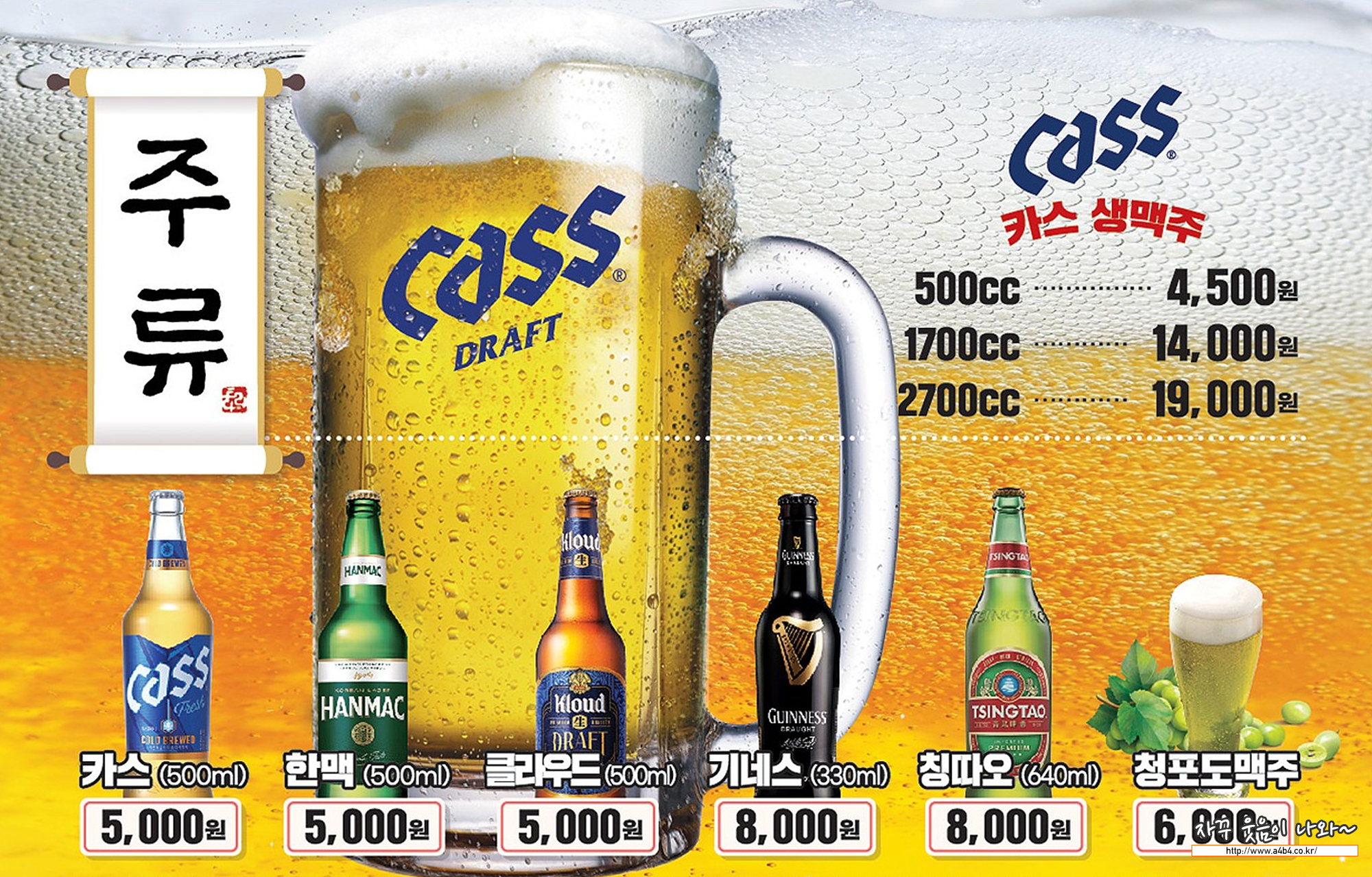 투다리 주류는 생맥주와 카스, 한맥, 클라우드 등의 국산 병맥주와 기네스, 칭따오 병맥주가 준비되어 있습니다. 소주는 처음처럼과 새로, 청하가 판매되고 있습니다. 소주나 맥주는 5,000원 가격으로 요즘 술값 생각하면 무난한...