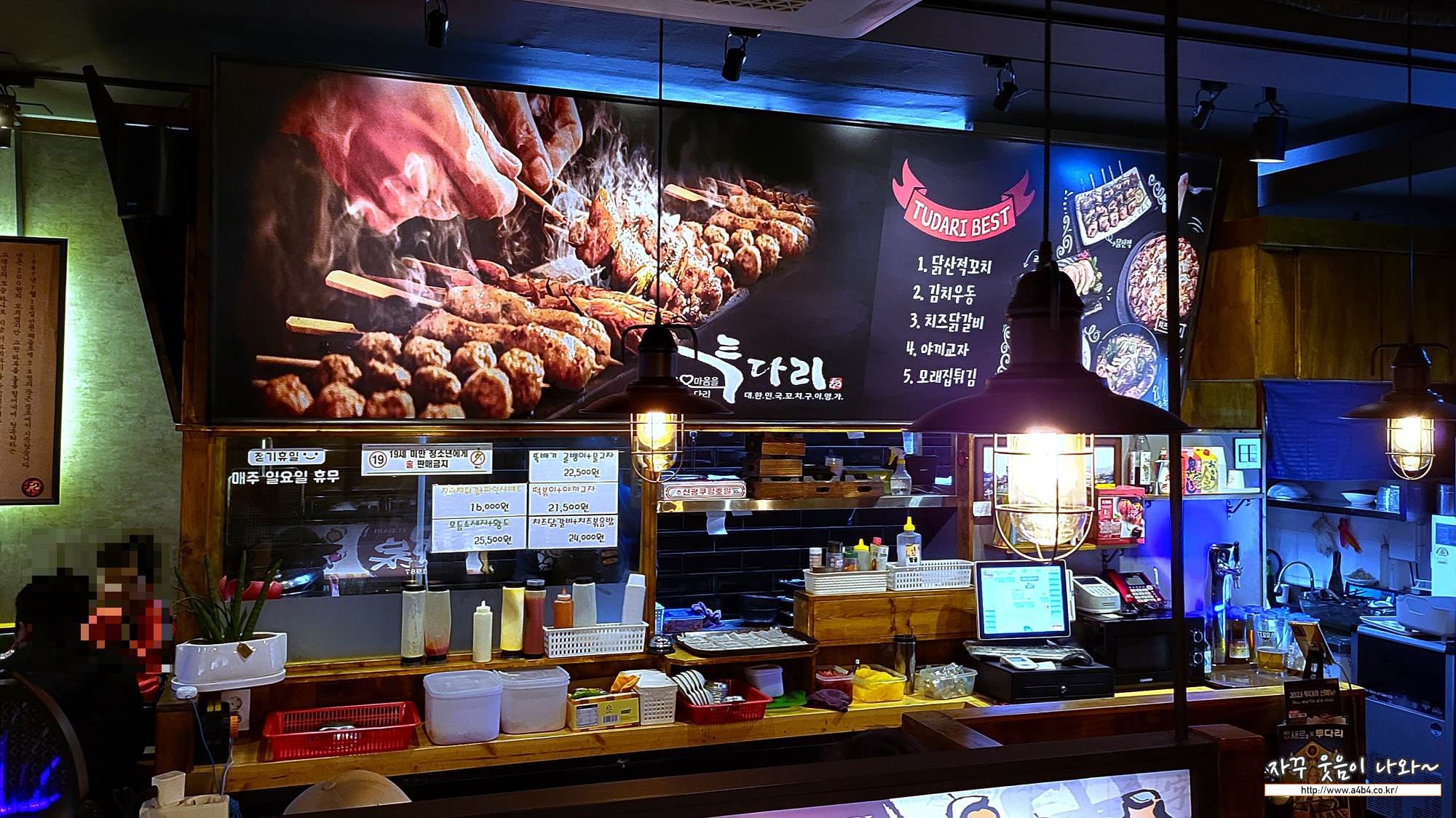 투다리 메뉴판 중간정도네요. 닭목살구이, 뚝배기떡볶이, 뚝배기 골뱅이무침, 모둠소세지, 치즈닭갈비 등의 특선메뉴와