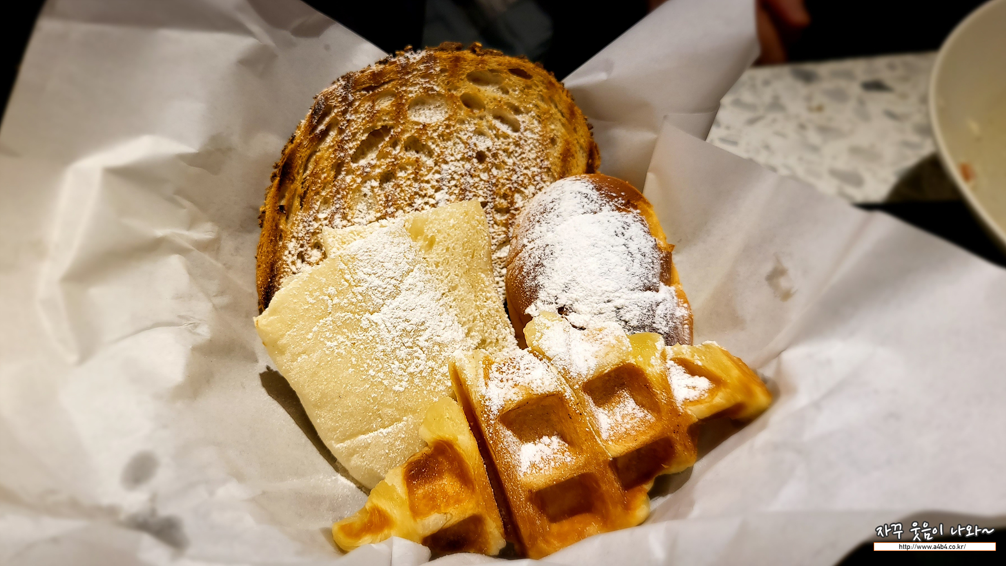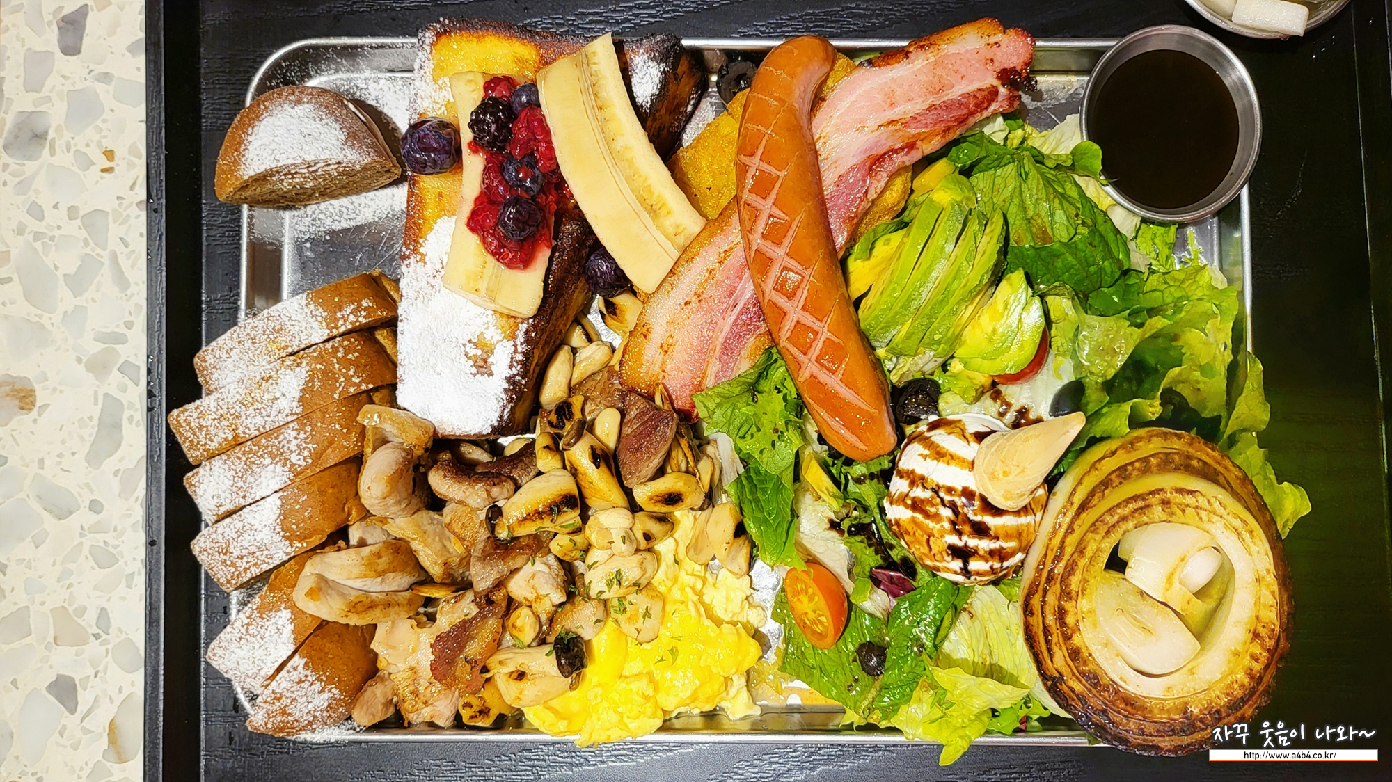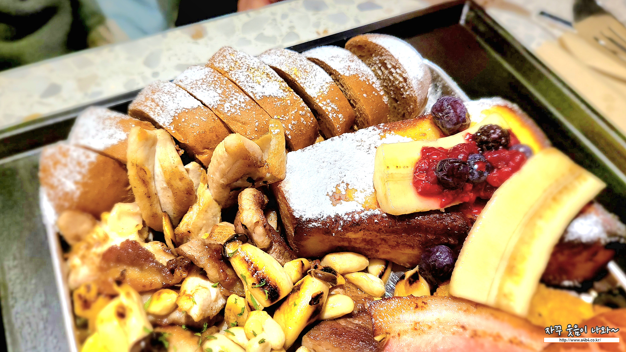 프렌치토스트, 해시브라운, 블루베리, 새송이 버섯 등의 빵류도 같이 나오네요. 상당히 푸짐하고 2~3인이 방문하셨다면 꼭 주문하셔서 나누어 드시는 것을 추천 드립니다