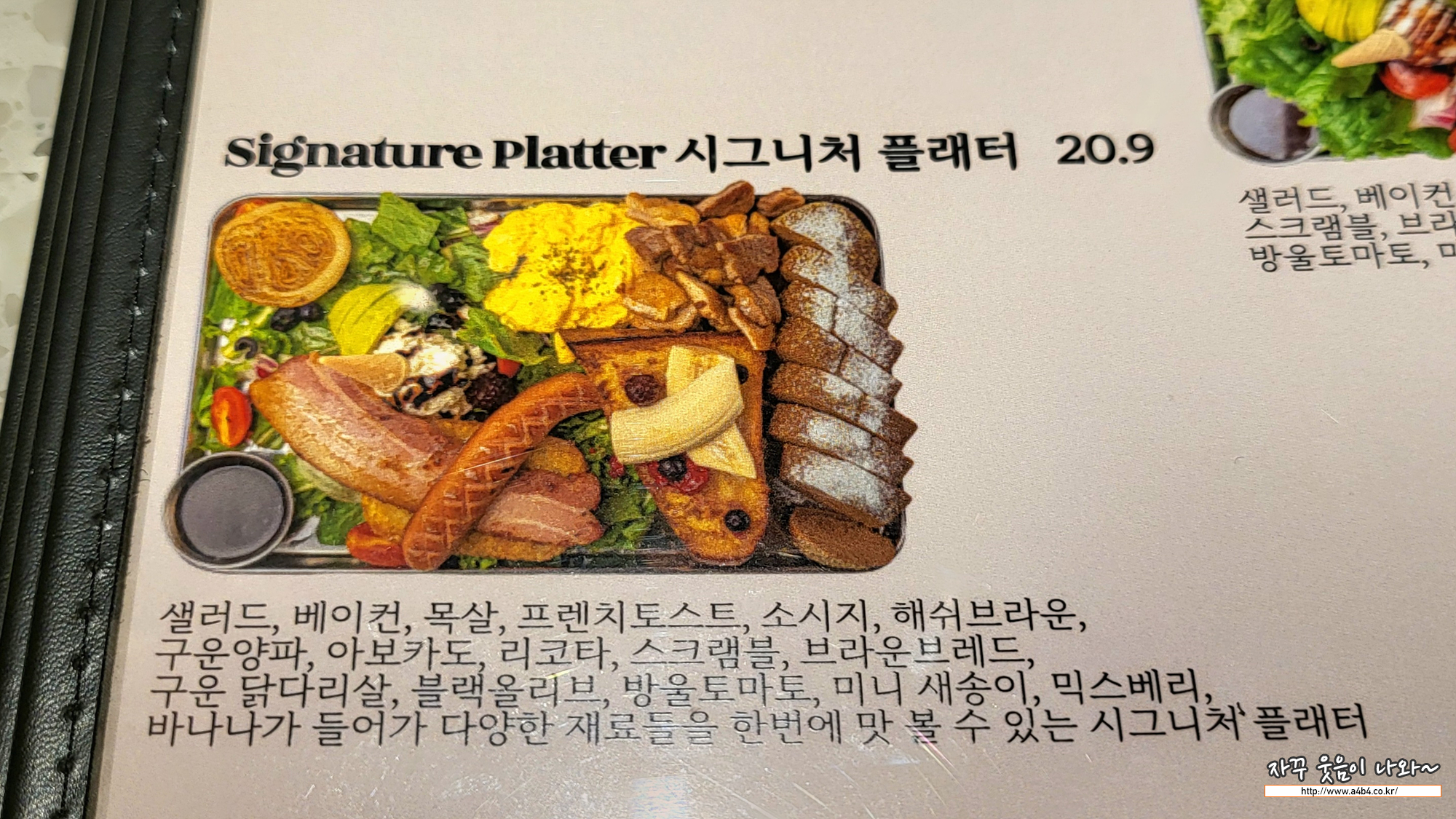 가성비도 좋고 양도 푸짐하고 상당히 맛있게 잘 먹은 메뉴 중 하나가 바로 계산동 브런치가든 시그니처 플래터 입니다. 구운 양파, 아보카도, 리코다, 스프램블, 블랙올리브, 방울토마토, 미니 새송이 등 다양한 야채와 견과류가 포함되어 있고요.
