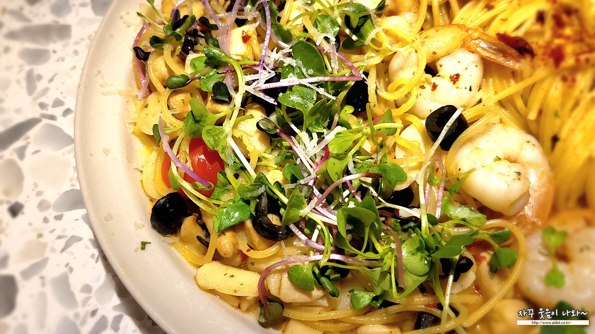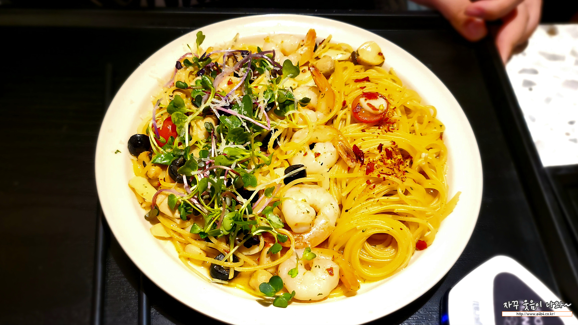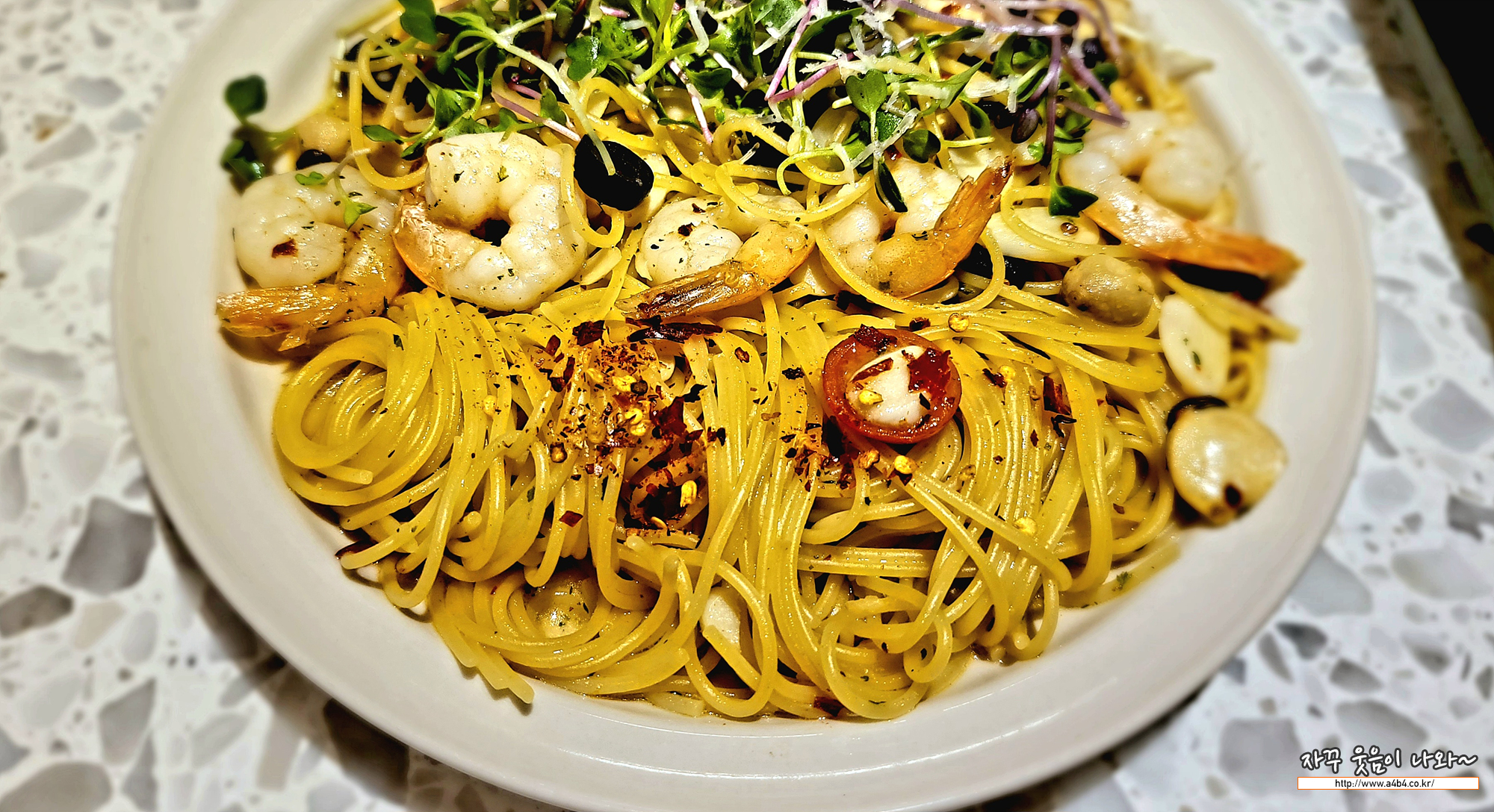 맛은 전형적인 오일 파스타 맛을 보여줍니다. 양도 무난하고 혼자 먹기에 딱 좋은 양과 맛을 보여줍니다. 새우도 가격대비 상당히 많이 넣어 있습니다.