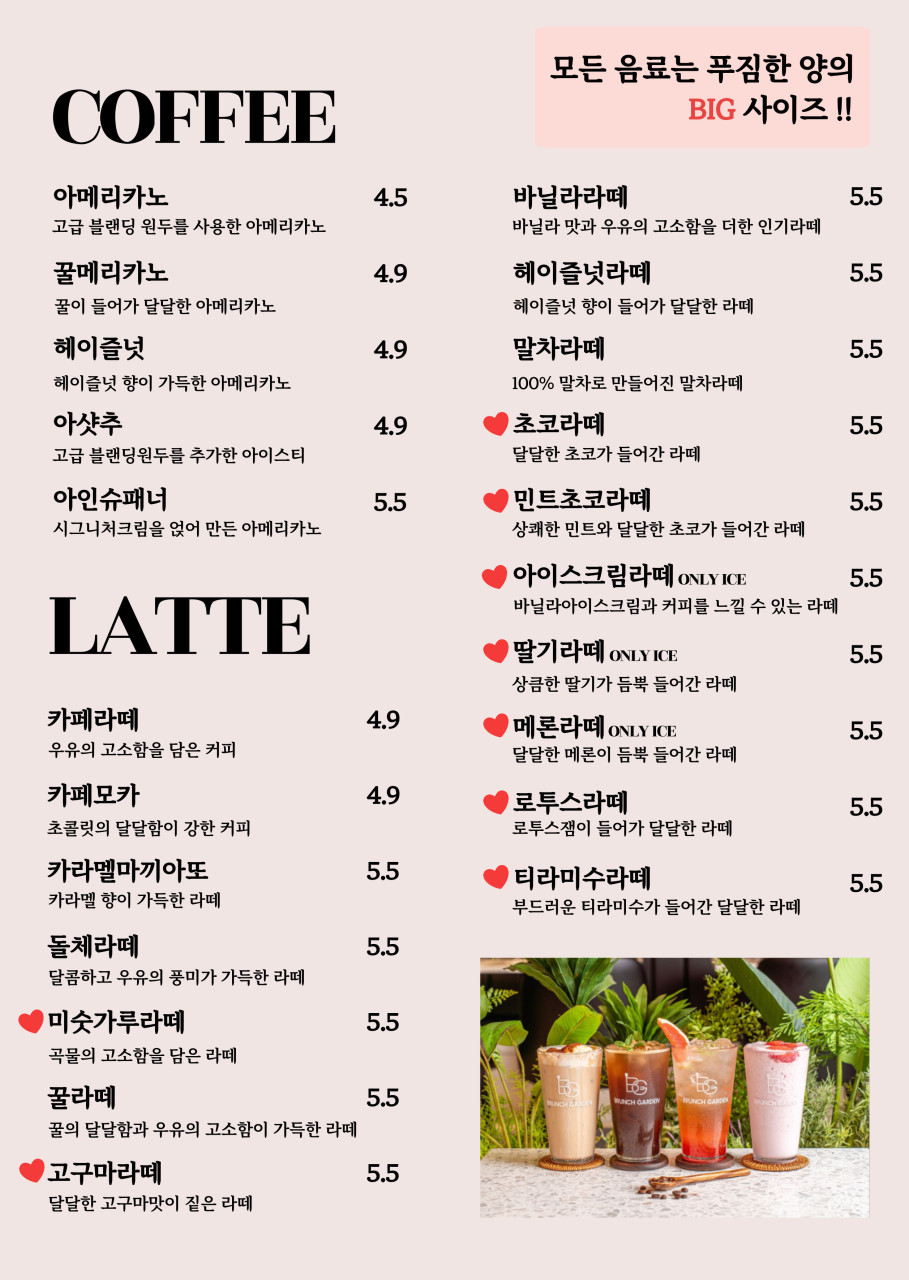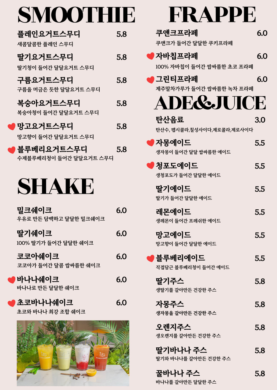 커피, 라떼, 스므디, 쉐이크, 프라페, 에이드와 차 등의 다양한 음료가 준비되어 있습니다. 가격은 5,000원 전후가격을 보입니다. 맥주와 칵테일은 7,000원 전후가격을 보입니다.