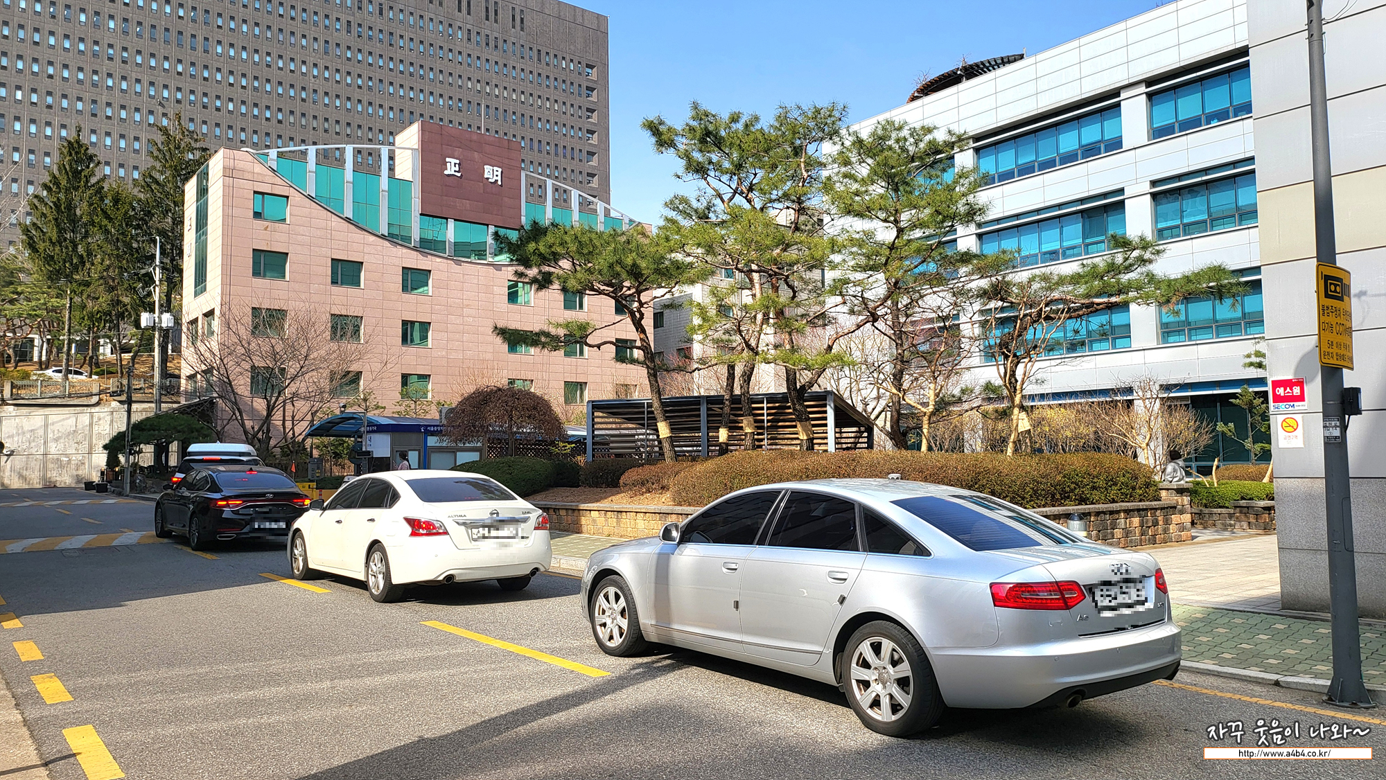 서울중앙지방법원등기국 주차장은 건물 지하 1층에 위치해 있습니다. 사진과 같이 월요일 오후인데, 이렇게 주차장 진입을 위해 도로에서 대기중인 차량이 여러대 보입니다. 한 대가 나와야 한 대가 들어갈 수 있는 상황인데요. 만약 서울중앙지방법원등기국 시간약속이 있으시다면 이 부분도 고려해서 방문하세요.