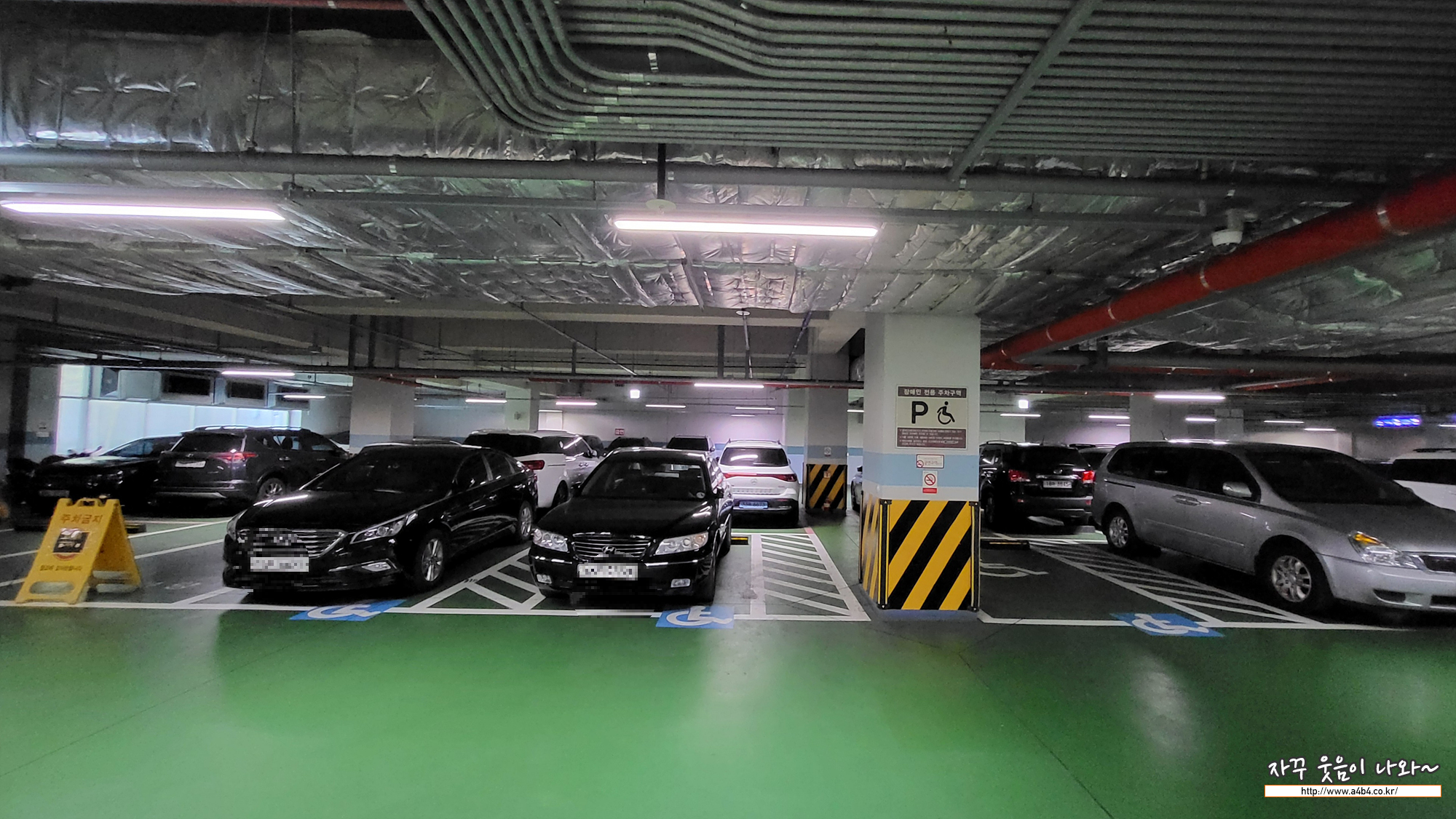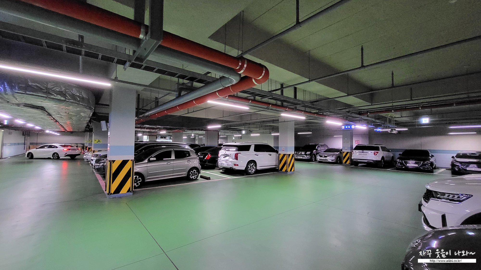 지하주차장 모습입니다. 지하 1층만 있으며, 비교적 깨끗하게 잘 관리되고 있습니다. 차간 거리는 보통이면 주차 난이도도 보통입니다. 지하에 주차장 관리요원은 없습니다. 그냥알아서 주차하시고 출차 하시면 됩니다.