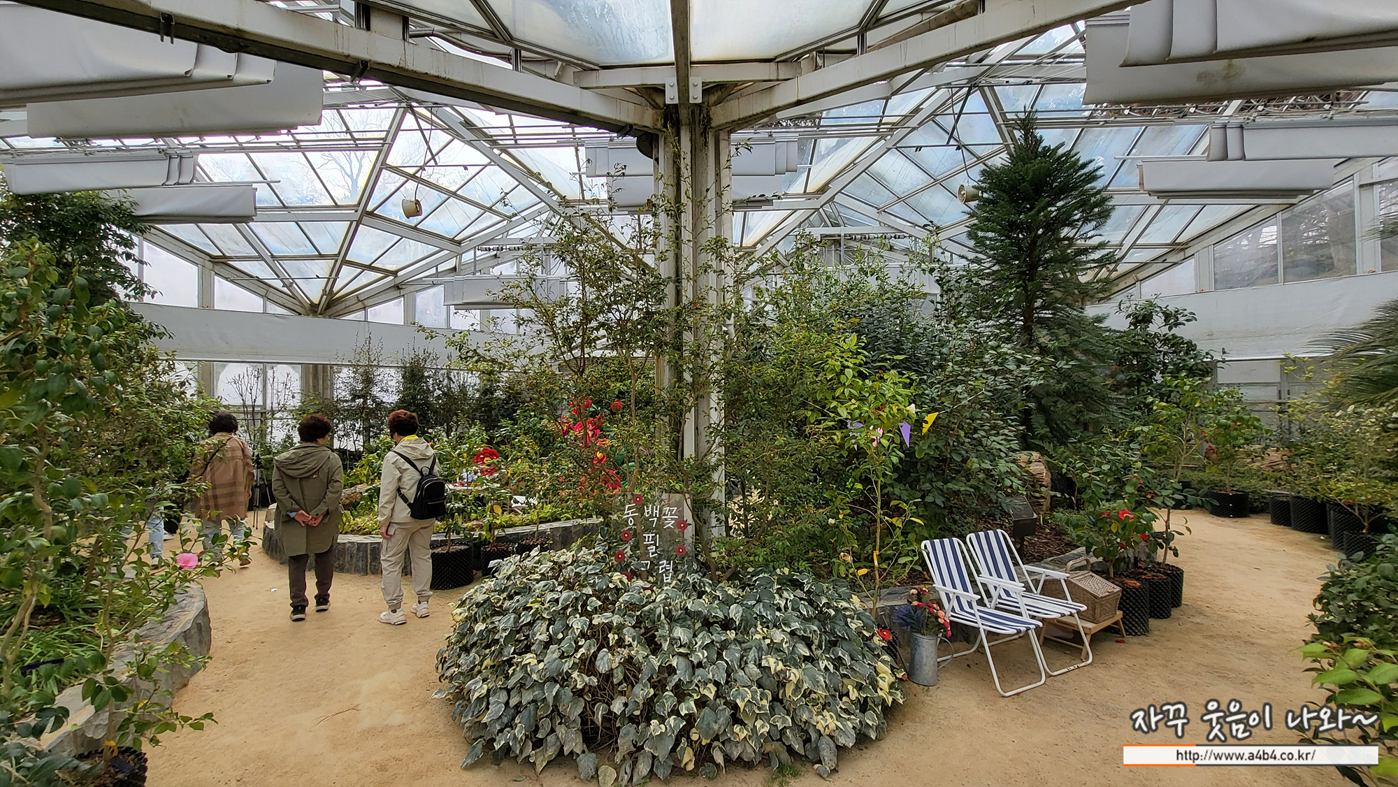 유리온실 안에는 거대한 동백꽃 모형을 배경으로 사진을 찍을 수 있게 마련된 포토존도 있습니다.