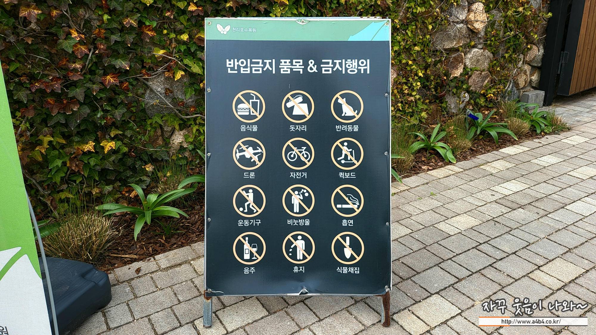 천리포 수목원은 자연시설이다 보니 몇가지 금지행위나 반입금지 품목이 있습니다. 음식물이나 드론, 운동기구 등 반입이 금지되어 있고요, 나머지 부분은 상식적인 수준에서 생각하시면 됩니다. 그렇다고 입구에서 소지품 검사를 하거나 그러지는 않습니다. 다만 아쉬운 부분은 천리포수목원 강아지 동반입장은 제한되어 있습니다.
