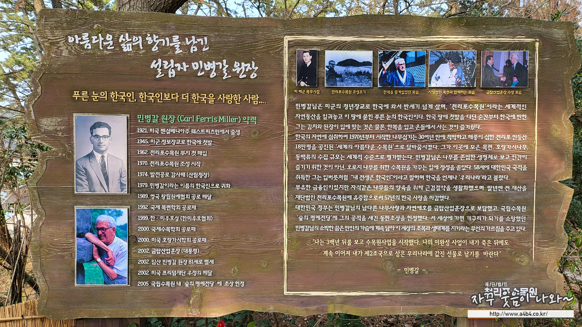 미국 펜실베니아주에서 출생한 민병갈 설립자는 40년 동안 한결같은 마음으로 충남 태안의 헐벗은 산림을 17,000여 종류의 식물 등이 살고 있는 세계적인 수목원으로 바꾸어 놓았습니다. 그가 국제적인 수목원을 만들 수 있었던 것은 오로지 식물에 대한 열정과 노력, 헌신이 있었기 때문일 것입니다. 전 재산을 수목원 조성 사업에 바쳤던 그는 2002년 4월 운명하는 그날까지도 자신이 사랑하는 수목원의 수목들이 잘 자라기를 간절히 바랐습니다. 2002년 타계한 후 2005년 박정희 전 대통령, 현신규 박사, 임종국 독림가, 김이만 나무할아버지에 이어 5번째로 ‘숲의 명예전당’ 에 헌정되어 이 땅에 보여준 헌신적인 식물사랑에 대하여 기록되어졌습니다.