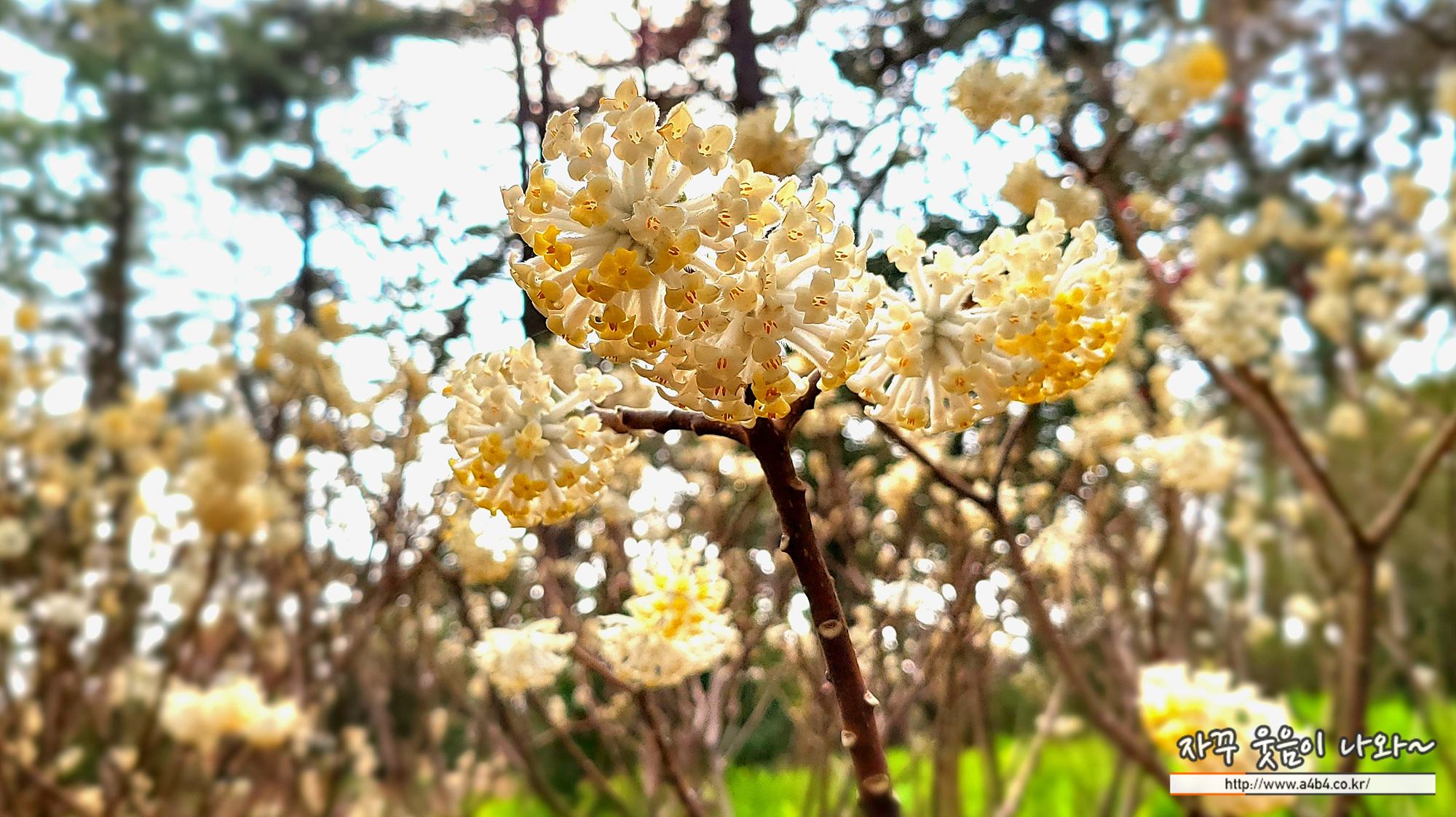 이곳 언덕에는 상당히 독특한 모양과 향을 뿜어내는 나무들이 있는데요. 이름이 '삼지닥나무'입니다. 중국이 원산지로 이름과 같이 종이를 만드는 원료라고 합니다. 요즘은 관상용으로 키우기도 한다네요. (Edgeworthia chrysantha)