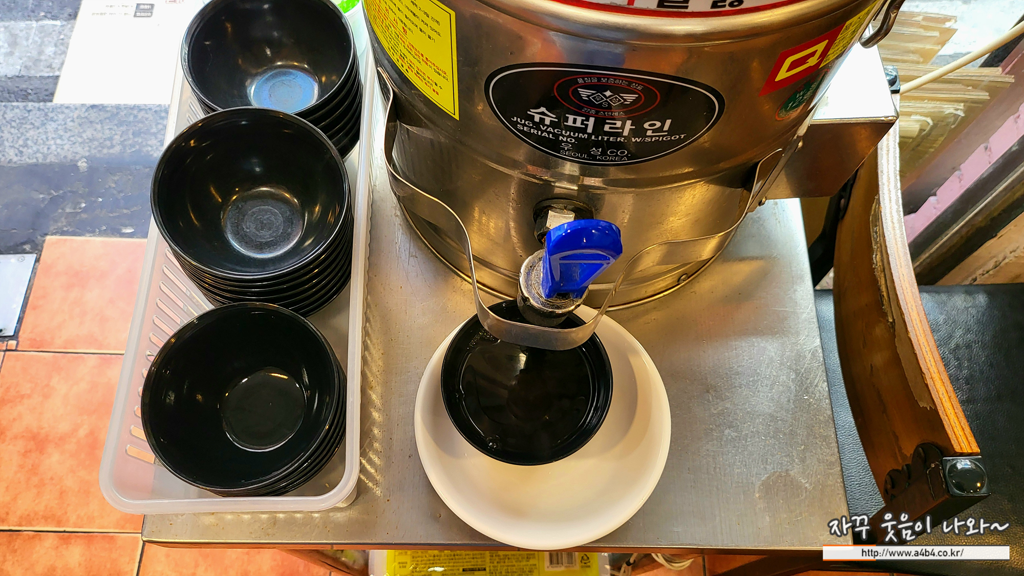 우동 국물도 셀프로 가지고 오시면 됩니다. 위에 튀김가루 같은 것은 없지만 약간 느끼한 튀긴 돈까스에 따뜻한 국물이 잘 어울리는 궁합이네요.