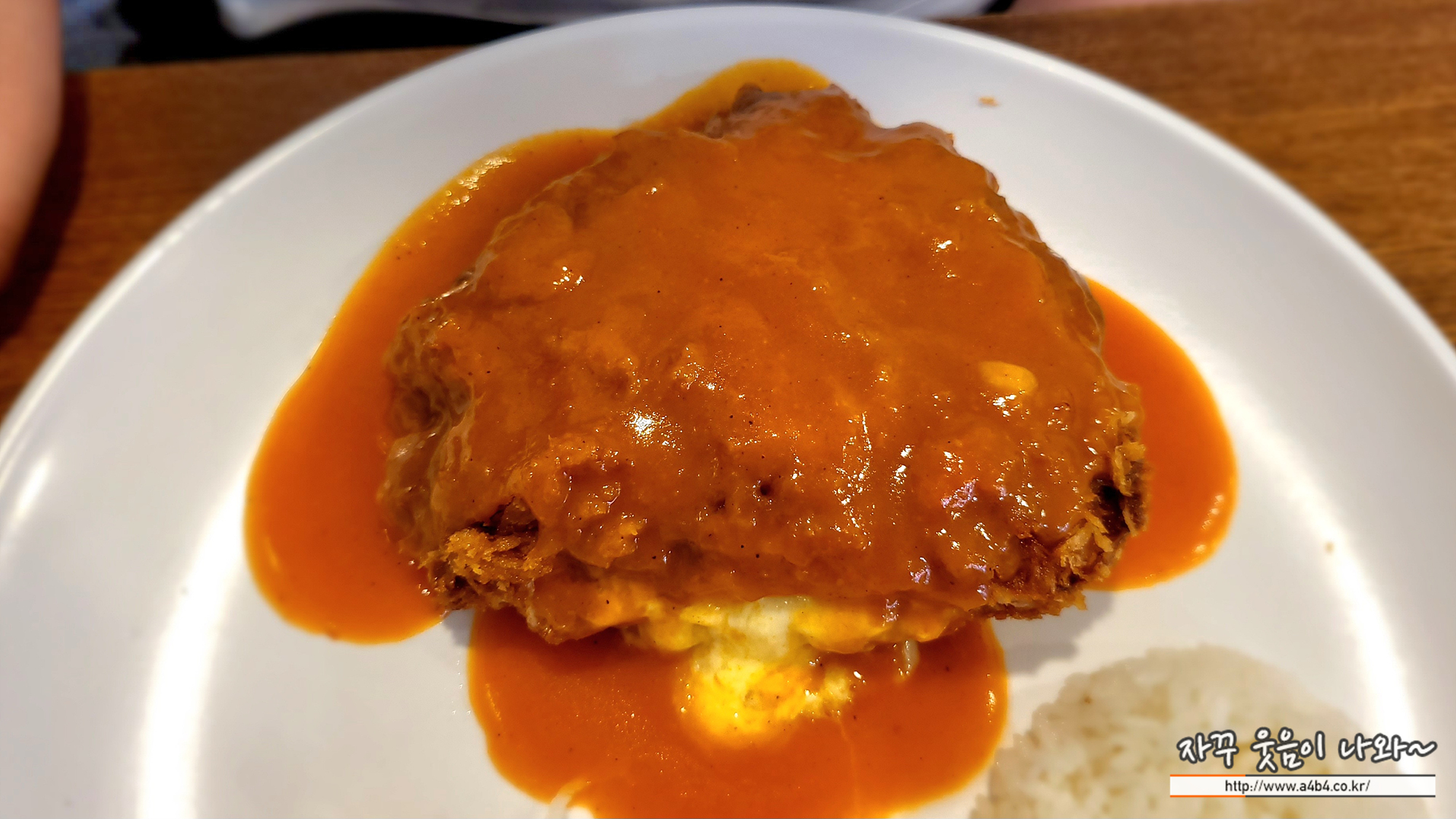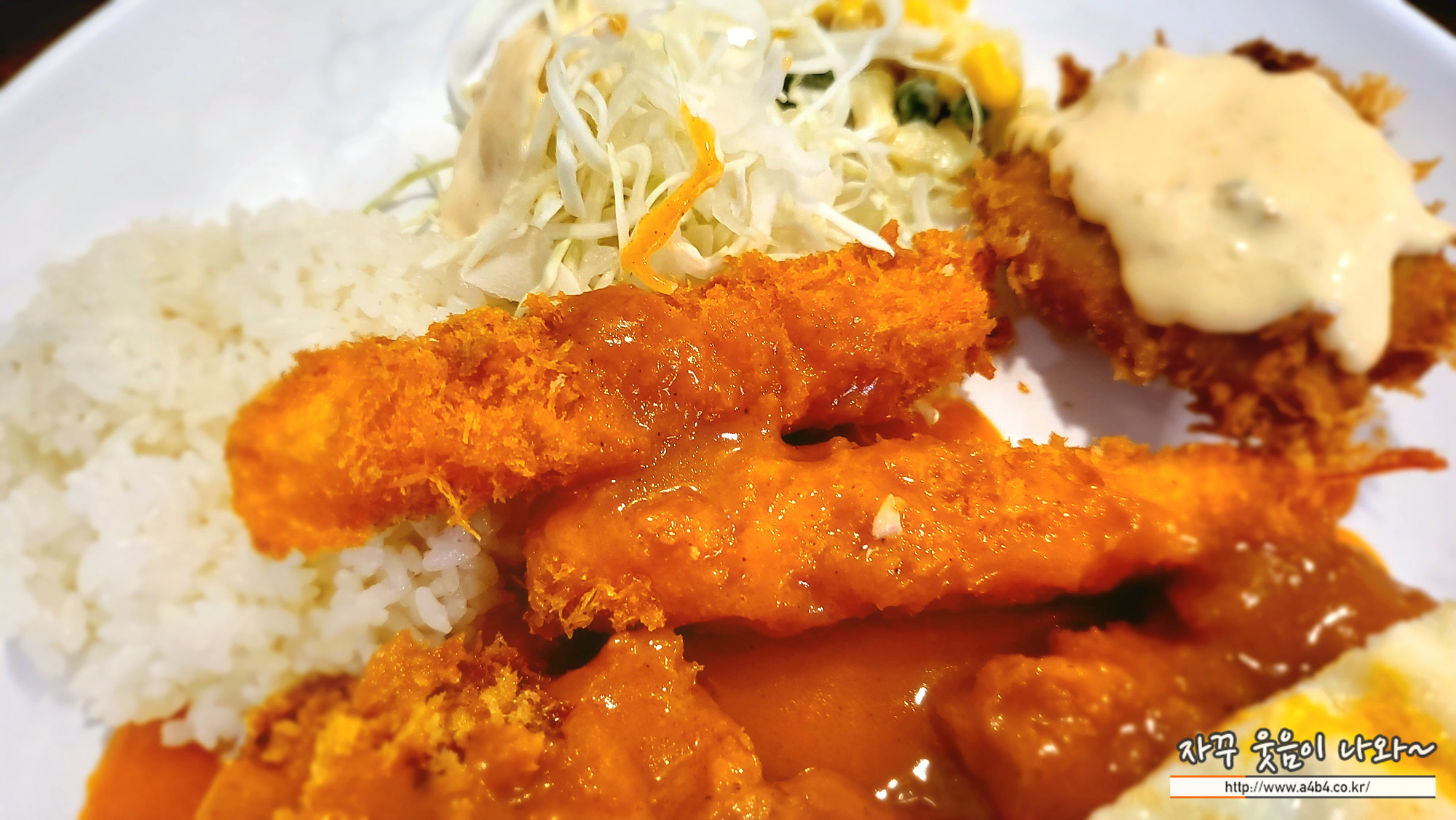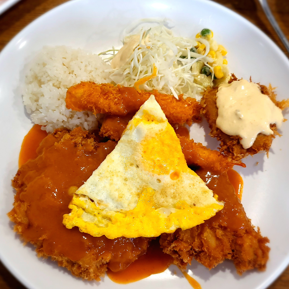 돈가스와 함께 새우튀김, 생선까스가 같이 나오는 세트메뉴 입니다. 여기에 피자조각 모양의 계란 프라이가 얹어 있네요. 요 계란은 상당히 신기하다는...