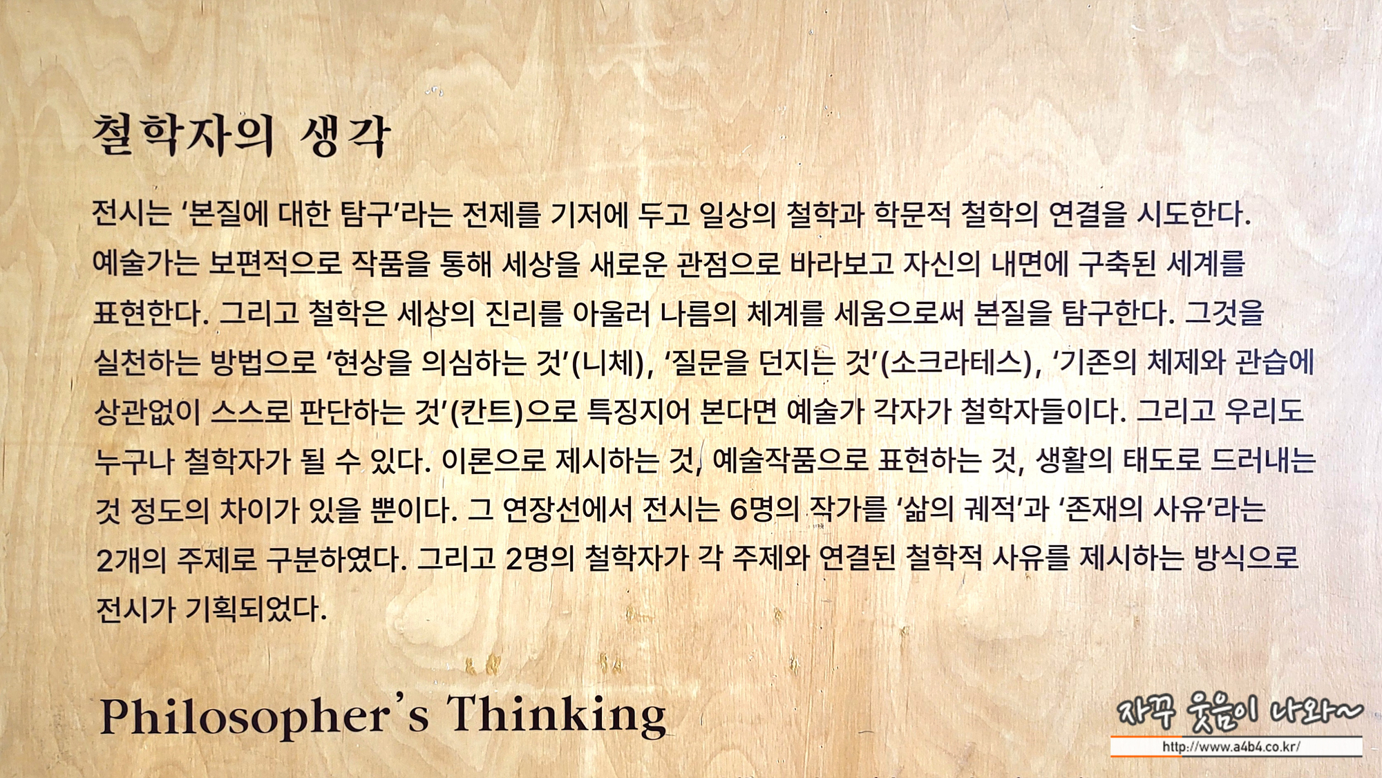 그것을 실천하는 방법으로 '현상을 의심하는 것'(니체), '질문을 던지는 것'(소크라테스), '기존의 체제와 관습에 상관없이 스스로 판단하는 것'(칸트)으로 특징지어 본다면 예술가 각자가 철학자들이다. 그리고 우리도 누구나 철학자가 될 수 있다. 이론으로 제시하는 것, 예술작품으로 표현하는 것, 생활의 태도로 드러내는 것 정도의 차이가 있을 뿐이다. 그 연장선에서 전시는 6명의 작가를 '삶의 궤적'과 '존재의 사유'라는 2개의 주제로 구분하였다. 그리고 2명의 철학자가 각 주제와 연결된 철학적 사유를 제시하는 방식으로 전시가 기획되었다.