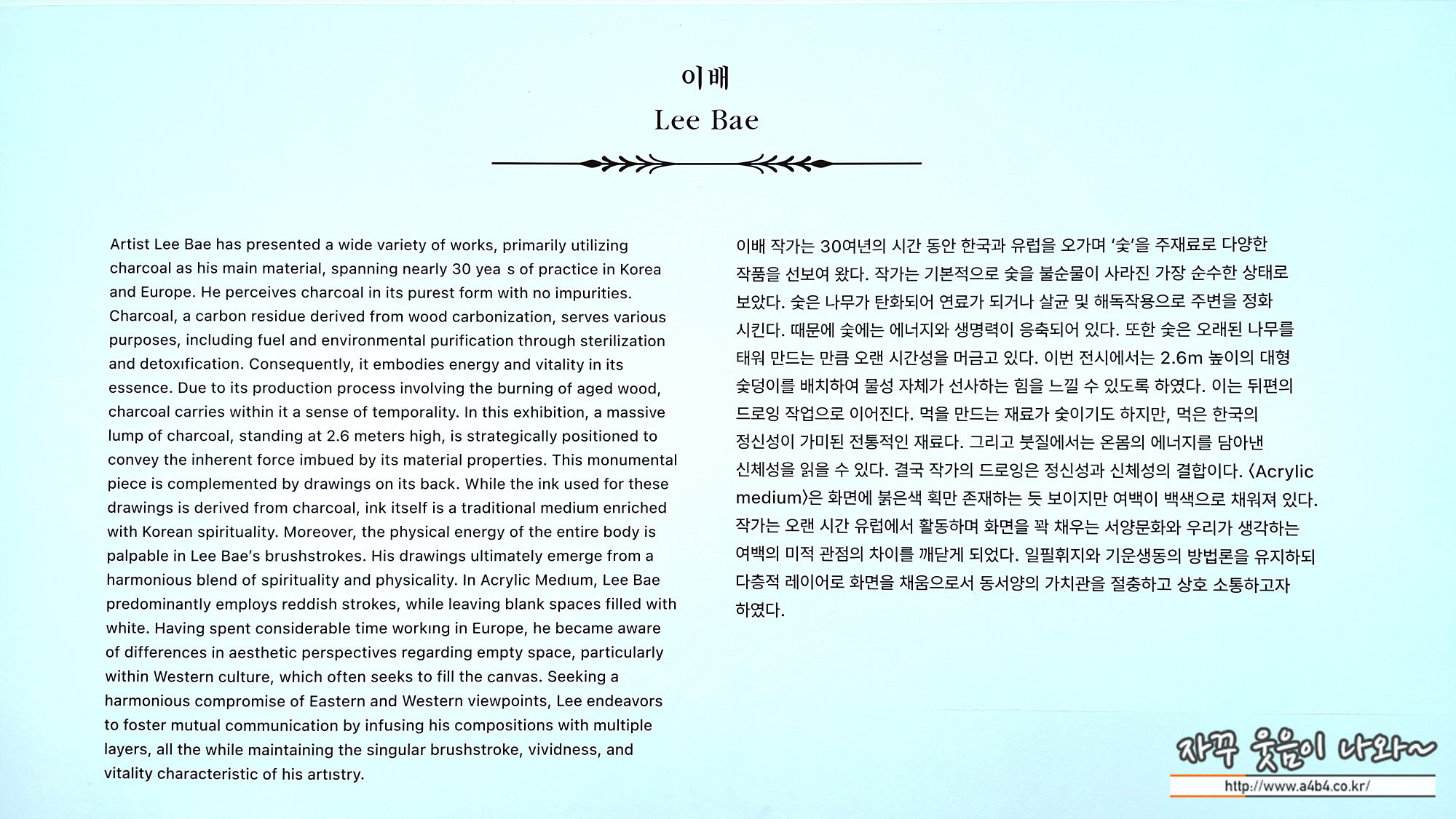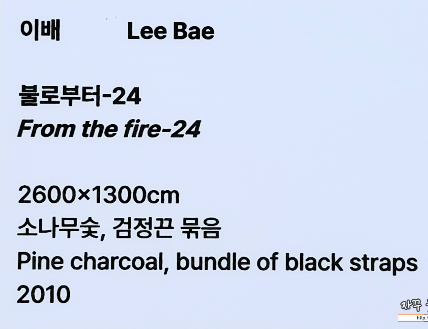 이배 작가의 가장 잘 알려진 작품연작 숯을 이용하여 이러한 입체 조형물 또는 액자형의 평면 작품들이 있는데, 이번에는 거대한 조형물이 전시되어 있습니다. 아쉽게도 이번 소마미술관 개관 20주년 특별전 '드로잉, 삶의 철학을 그리다' 에서 이배 작가의 작품은 많이 만나볼 수 없습니다.