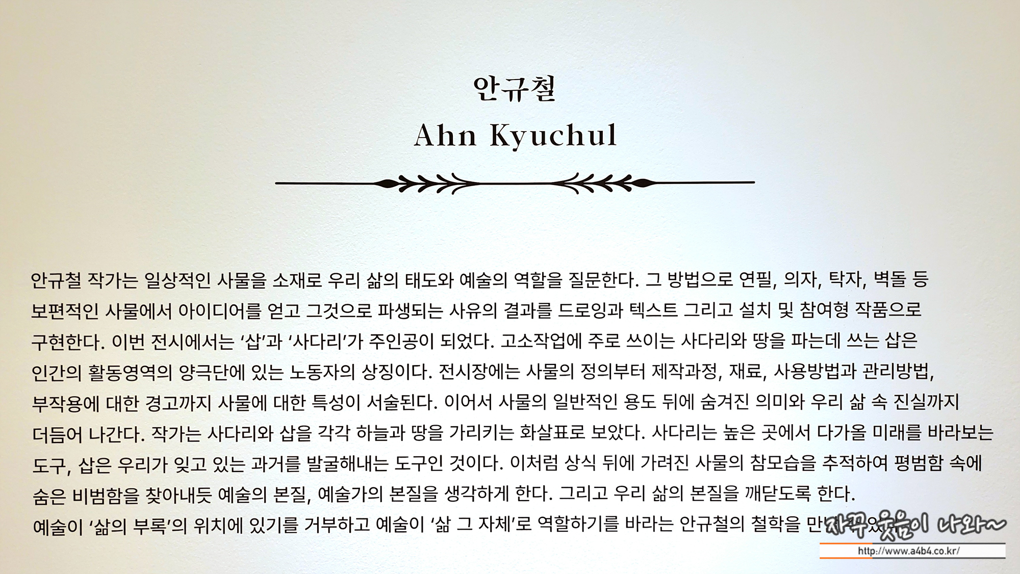 30여년의 시간 동안 한국 안규철 작가는 일상적인 사물을 소재로 우리 삶의 태도와 예술의 역할을 질문한다. 그 방법으로 연필, 의자, 탁자, 벽돌 등 보편적인 사물에서 아이디어를 얻고 그것으로 파생되는 사유의 결과를 드로잉과 텍스트 그리고 설치 및 참여형 작품으로 구현한다. 이번 전시에서는 '삽'과 '사다리'가 주인공이 되었다.