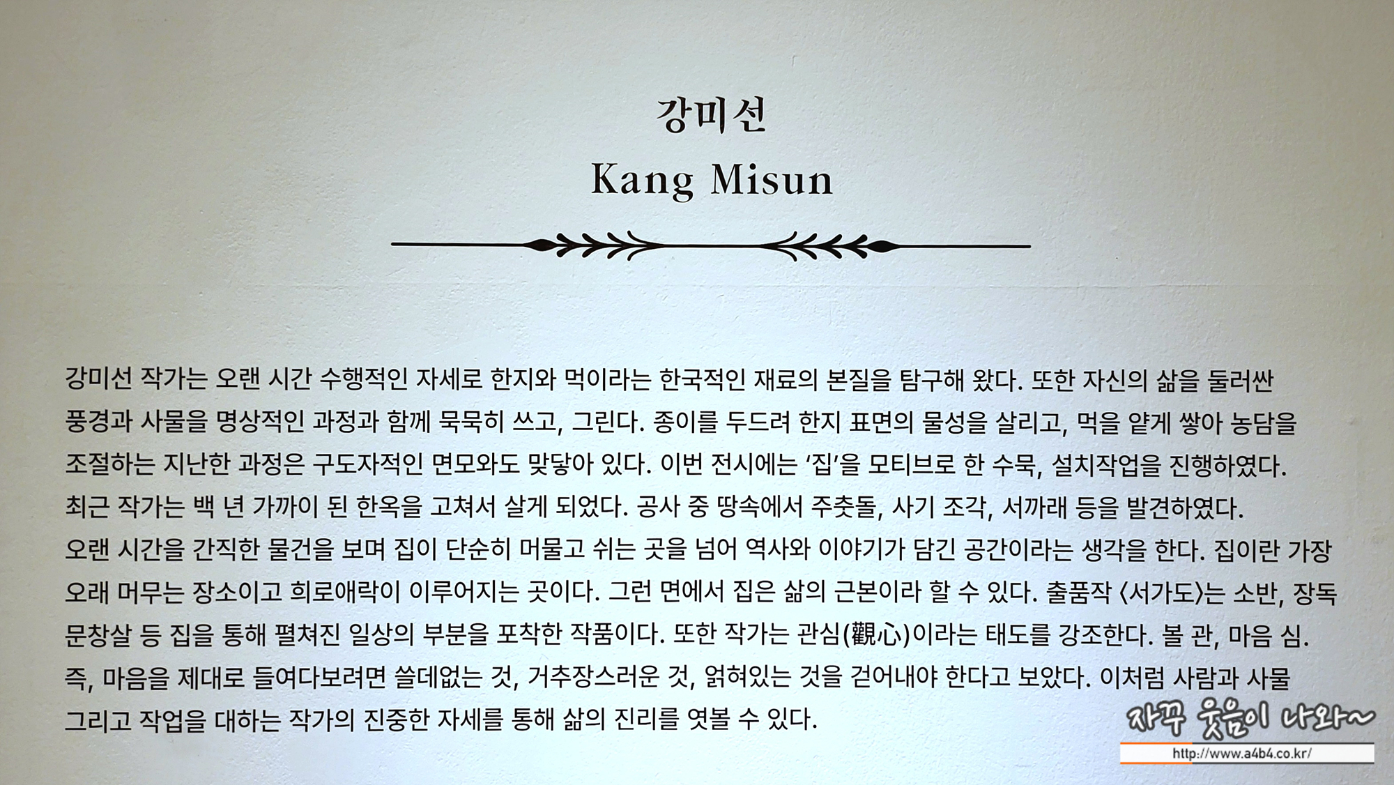 오랜 시간 수행적인 자세로 한지와 먹이라는 한국적인 재료의 본질을 탐구해 왔다. 또한 자신의 삶을 둘러싼 풍경과 사물을 명상적인 과정과 함께 묵묵히 쓰고, 그린다. 종이를 두드려 한지 표면의 물성을 살리고, 먹을 얕게 쌓아 농담을 조절하는 지난한 과정은 구도자적인 면모와도 맞닿아 있다. 이번 전시에는 '집'을 모티브로 한 수묵, 설치작업을 진행하였다.