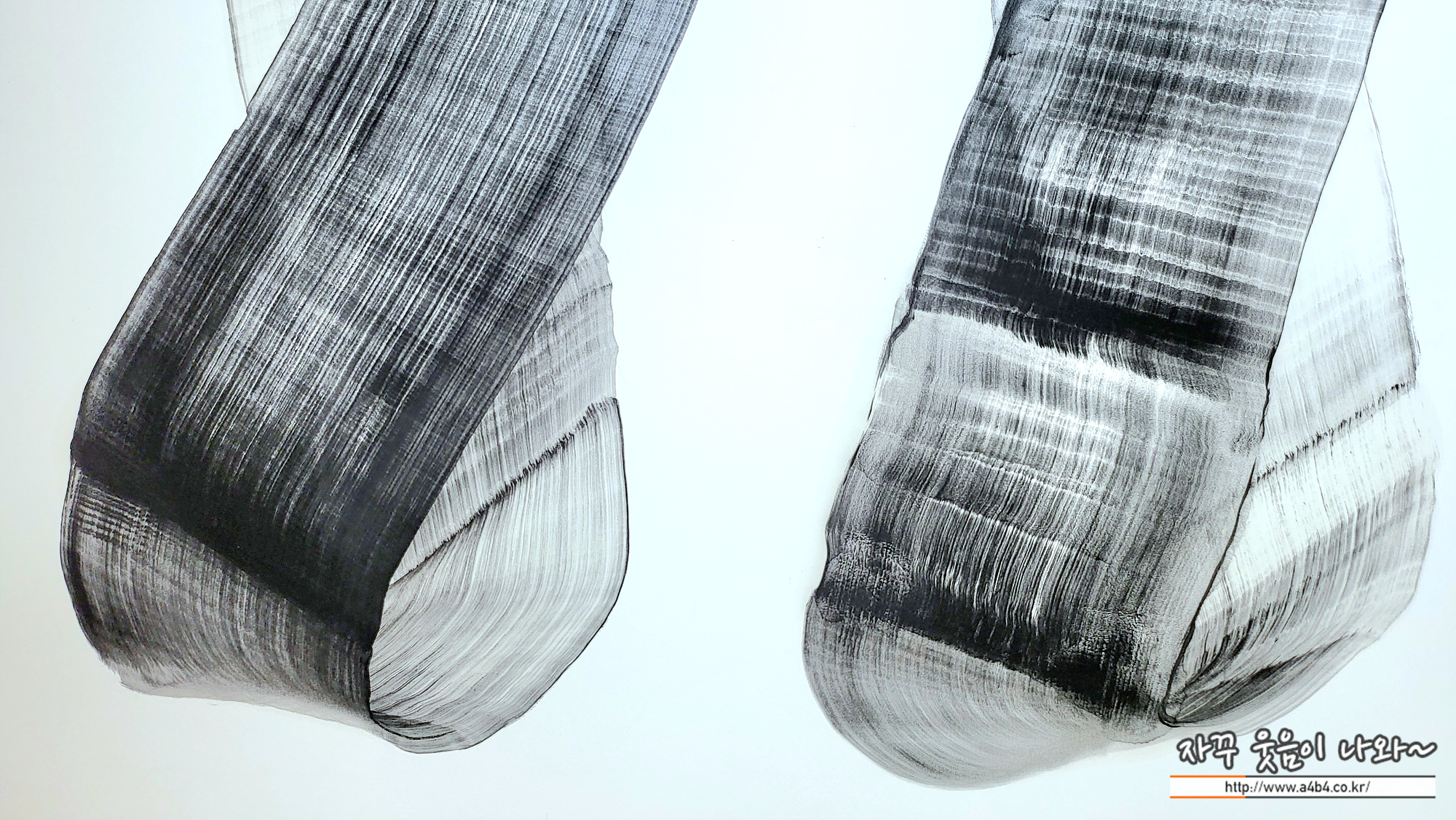 이는 뒤편의 드로잉 작업으로 이어진다. 먹을 만드는 재료가 숯이기도 하지만, 먹은 한국의 정신성이 가미된 전통적인 재료다. 그리고 붓질에서는 온몸의 에너지를 담아낸 신체성을 읽을 수 있다. 결국 작가의 드로잉은 정신성과 신체성의 결합이다. 〈Acrylic medium)은 화면에 붉은색 획만 존재하는 듯 보이지만 여백이 백색으로 채워져 있다. 작가는 오랜 시간 유럽에서 활동하며 화면을 꽉 채우는 서양문화와 우리가 생각하는 여백의 미적 관점의 차이를 깨닫게 되었다. 일필휘지와 기운생동의 방법론을 유지하되 다층적 레이어로 화면을 채움으로서 동서양의 가치관을 절충하고 상호 소통하고자 하였다.
