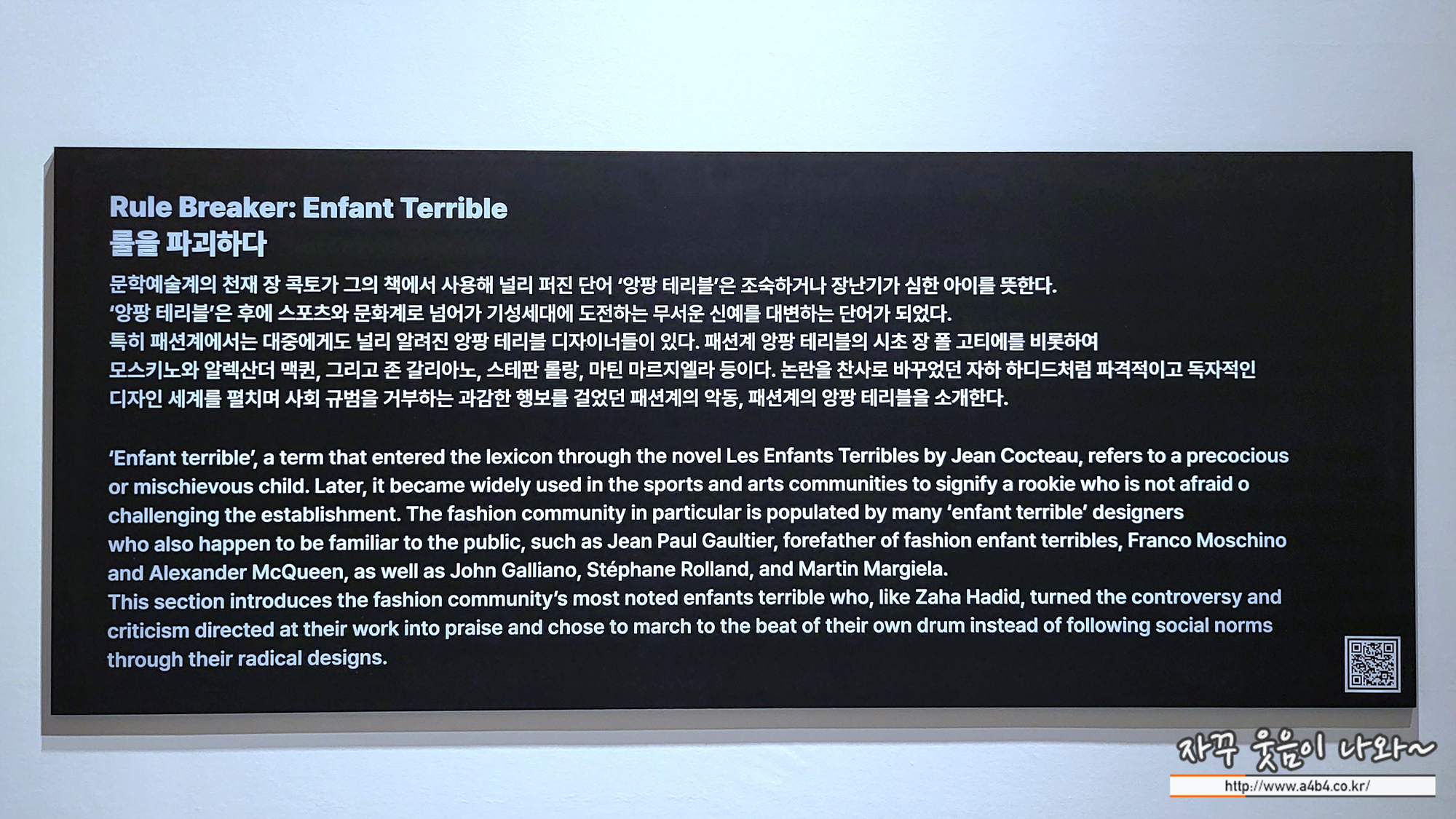 RSVP: 위대한 유산으로의 초대 ‘Rule Breaker(룰을 파괴하다)’ 에서는 ‘앙팡 테리블(기성세대에 도전하는 무서운 신예)’로 불리는 디자이너들의 다양한 작품들을 만날 수 있습니다. 특히 앙팡 테리블의 시초로 여겨지는 장 폴 고티에를 비롯한 마틴 마르지엘라, 존 갈리아노 등 대중에게 널리 알려진 디자이너들의 과감하고 독자적인 컬렉션을 한자리에 모았습니다..