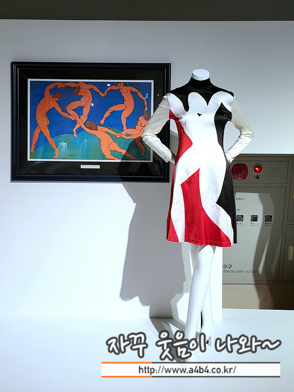 앙리 마티스의 1910년 작 ‘춤Ⅱ’를 모티프로 장 폴 고티에가 제작한 드레스이다. 고티에는 원화에서 각각 사람과 하늘, 대지를 표현한 적청녹 세 가지 색을 백흑적으로 대체하였다. 그림 속 춤을 추는 사람의 팔이 의상의 소매 부분과 연결되어 옷을 입은 착용자의 움직임이 그림에 반영되는 위트가 담겼다.