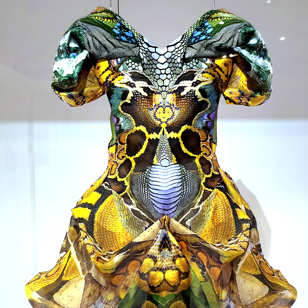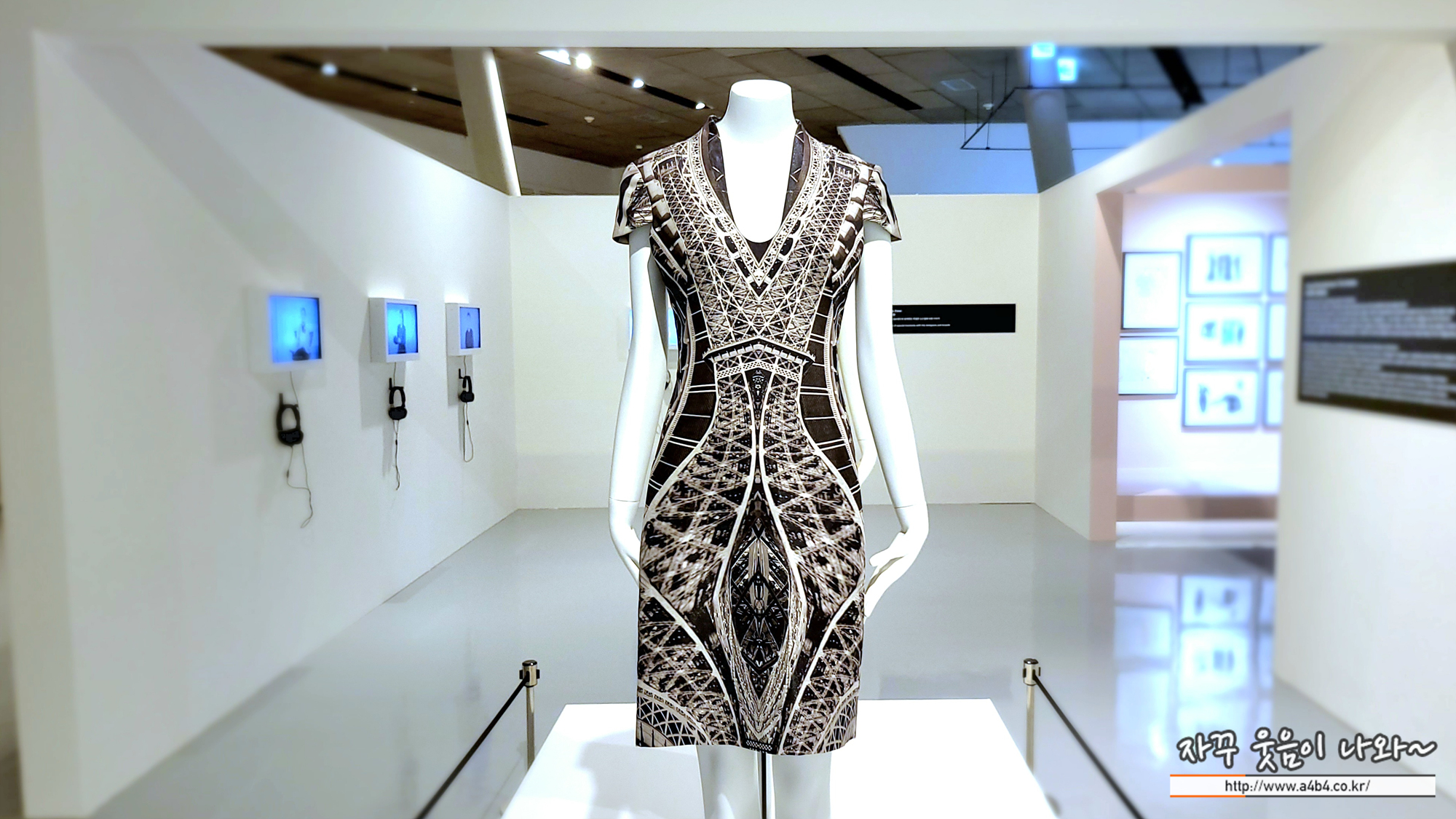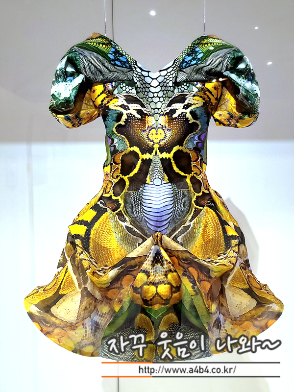 알렉산더 맥퀸이 사망하기 전 마지막 컬렉션의 드레스이다. 그가 그린 ‘플라톤의 아틀란티스’는 종말론적 미래 세계였다. 빙하가 녹은 해저 환경을 배경으로 모델들은 파충류와 양서류를 연상시키는 디지털 프린팅 드레스와 아르마딜로 슈즈를 신고 등장했다. 이는 맥퀸이 암시한 진화를 역전하여 모든 것이 탄생한 바다로 돌아간 생명체의 이미지였다. 죽음에 대한 동경을 넘어, 마치 고통과 죽음을 딛고 안식처를 찾은 불멸의 아름다움을 담은듯했다