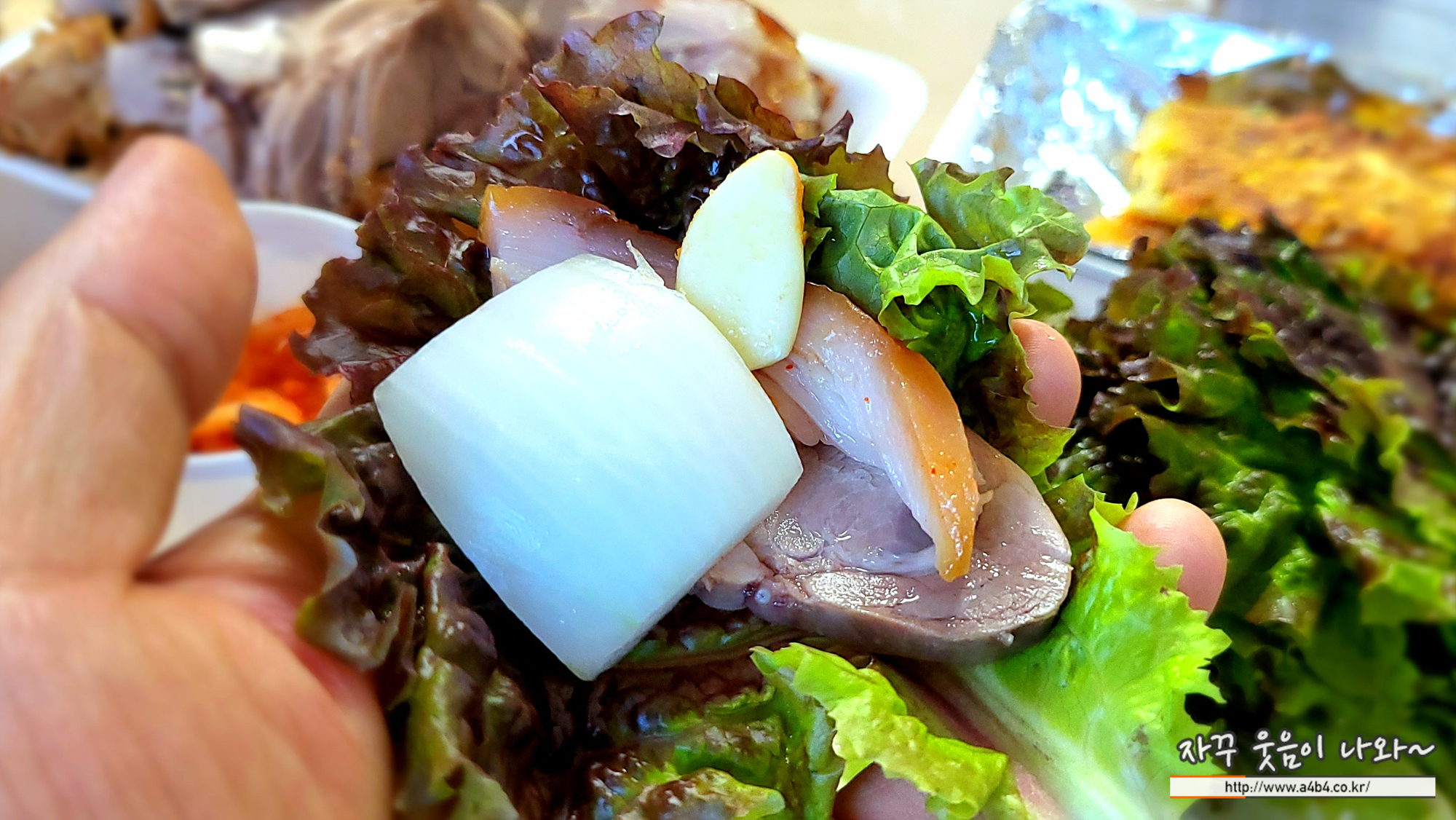 먼저 상추에 이렇게 족발 한 쌈 먹습니다. 맛있어요.