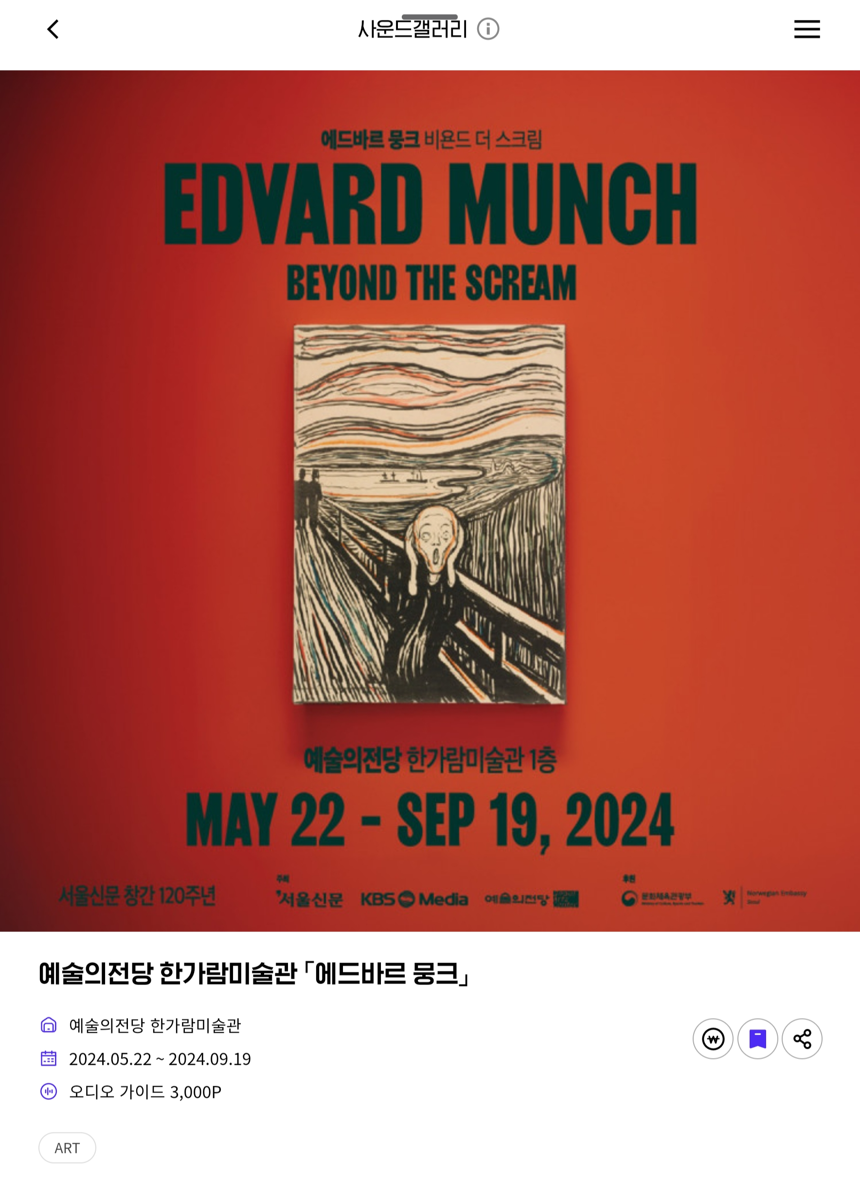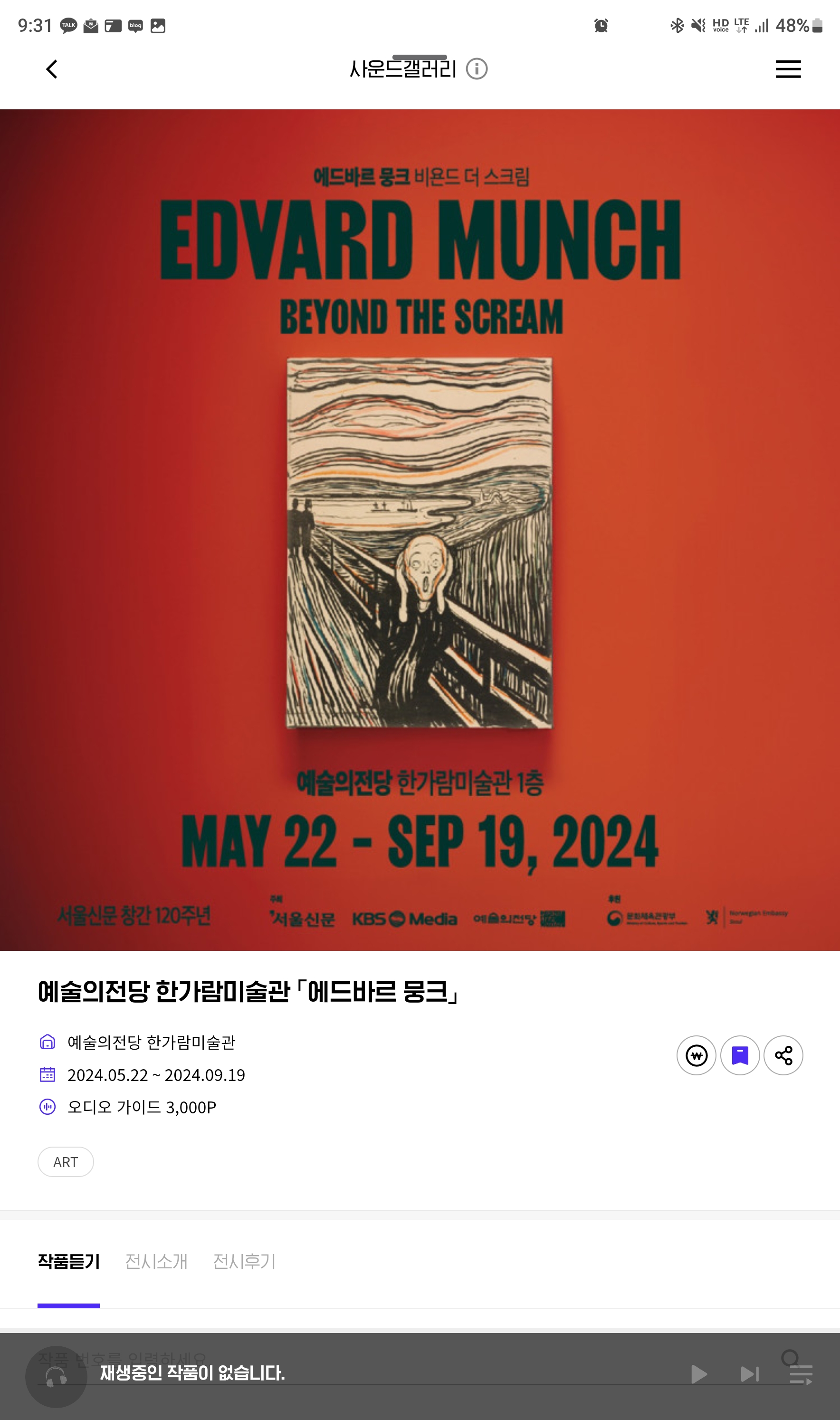 요즘 현대에서 문화예술 오디오가이드 신경 많이 쓰네요. 이번 뭉크전시회 오디오가이드도 H.포인트앱 오디오갤러리에서 이용이 가능합니다. 물론 3,000원 요금은 동일합니다만, 내 기기와 내 이어폰을 사용한다는 부분과 전시장 방문 및 발권 여부와 상관없이 이용이 가능한 부분이 더 큰 매력입니다.