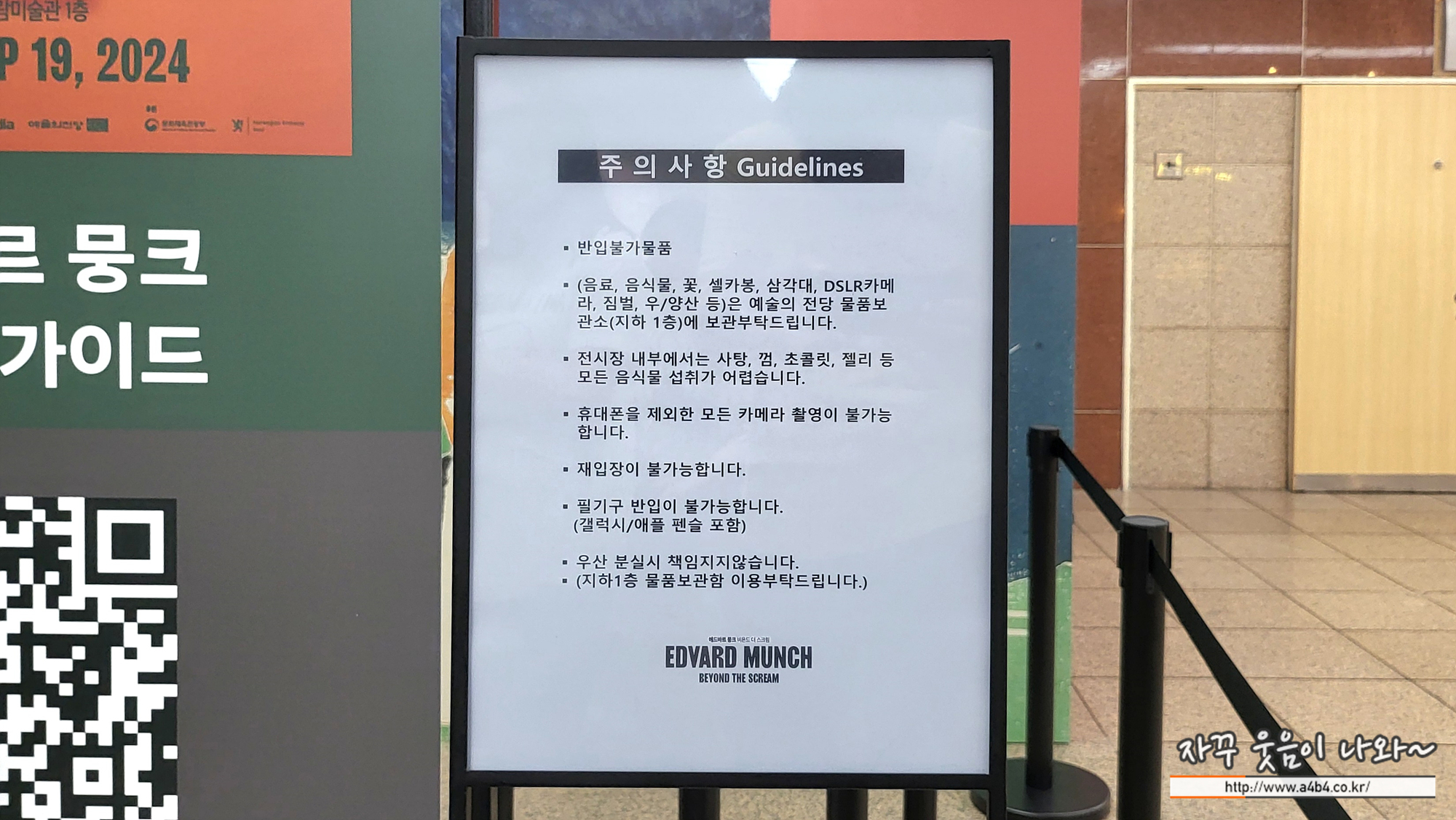 참고로 전시장 작품의 상당수가 유리나 안전장치 없이 액자에 끼워있거나 출입금지 라인이 없습니다. 뭉크의 작품이 상대적으로 작아서 가까이 다가가지 않으면 작품 디테일 감상이 어려운 이유라고 생각되는데요. 이러한 이유로 작품 보호을 위해반입금지 한 것이 아닐지....