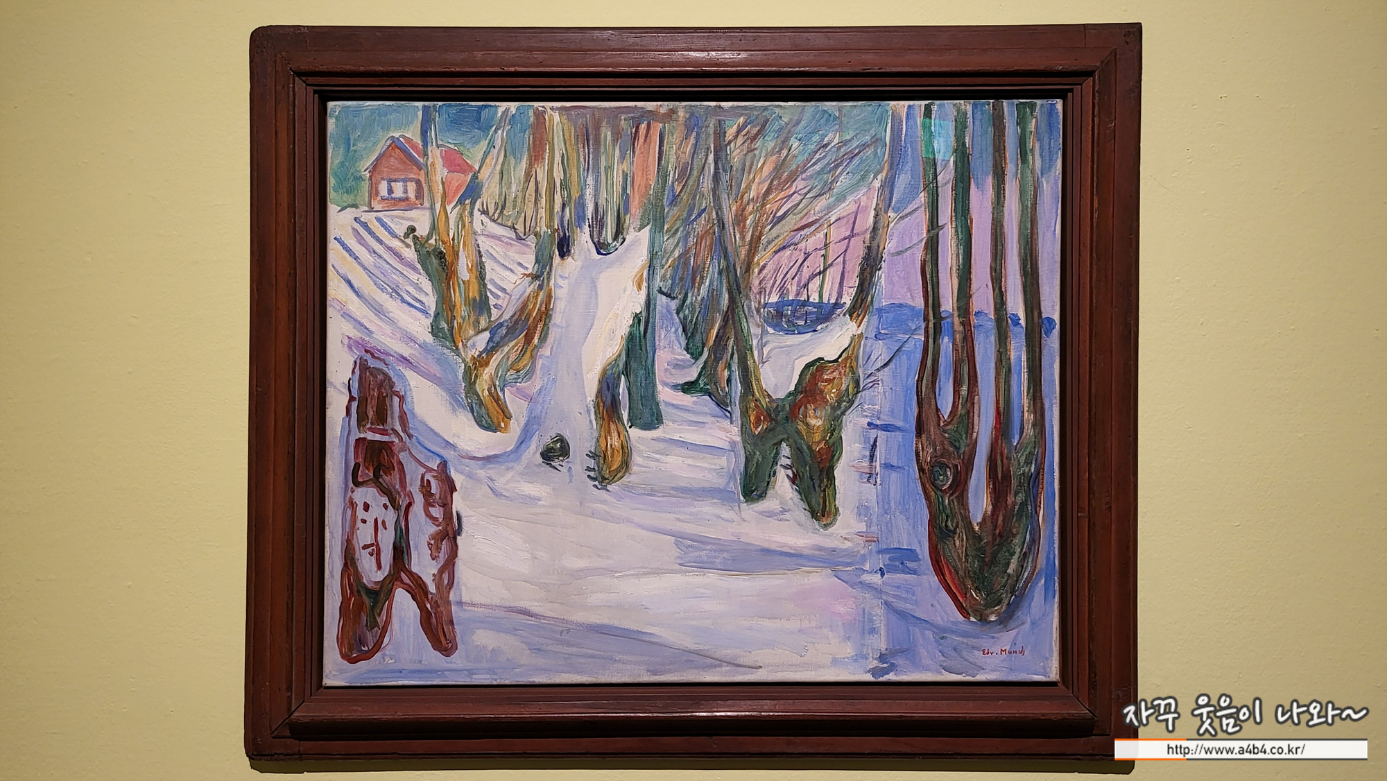 당시에 는 지구가 새로운 빙하기에 휩싸일 것이라는 두려움이 만연했습니다. 뭉크는 열렬한 신문 독자였고, 때문에 눈과 얼음에 대 한 표현이 그의 걱정을 어느정도 담고 있었을 것입니다. 뭉크의 겨울 풍경에는 노르웨이의 길고 어두운 겨울의 신비로움과 자연에 대한 경이로움이 담겨 있습니다. 우리 앞의 작품 < 눈 속의 거친 나무줄기>는 혹독한 추위 속에서도 끄떡없이 튼튼한 나무 줄기가 담긴 광활한 풍경이 펼쳐집니다. 뭉크 특유 의 대담하고 표현적인 붓놀림으로 완성된 이 작품은 거부할 수 없는 자연현상 속에서도 굳건히 자신의 자리를 지키는 자연 의경이로움을 느낄 수 있습니다.