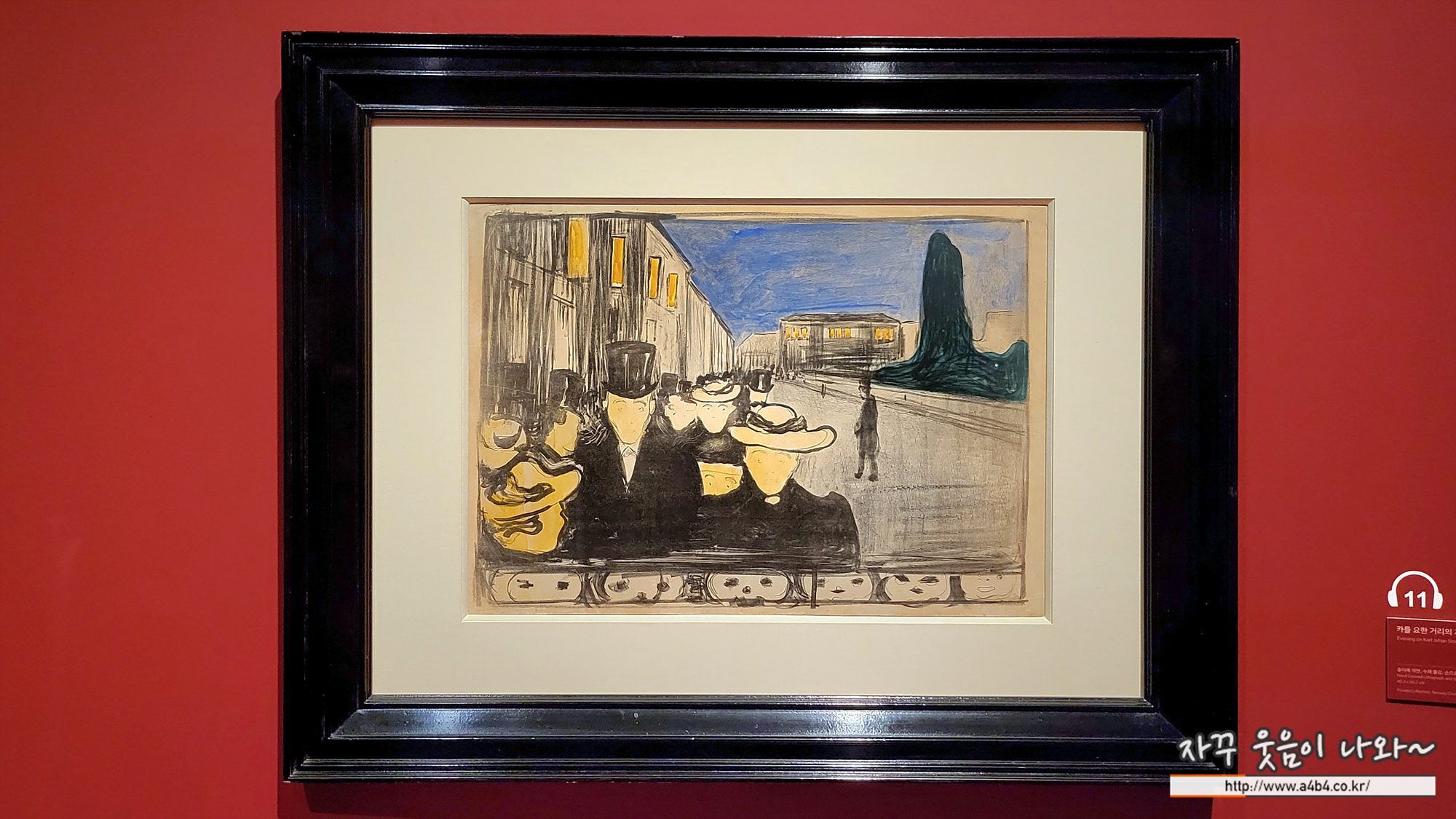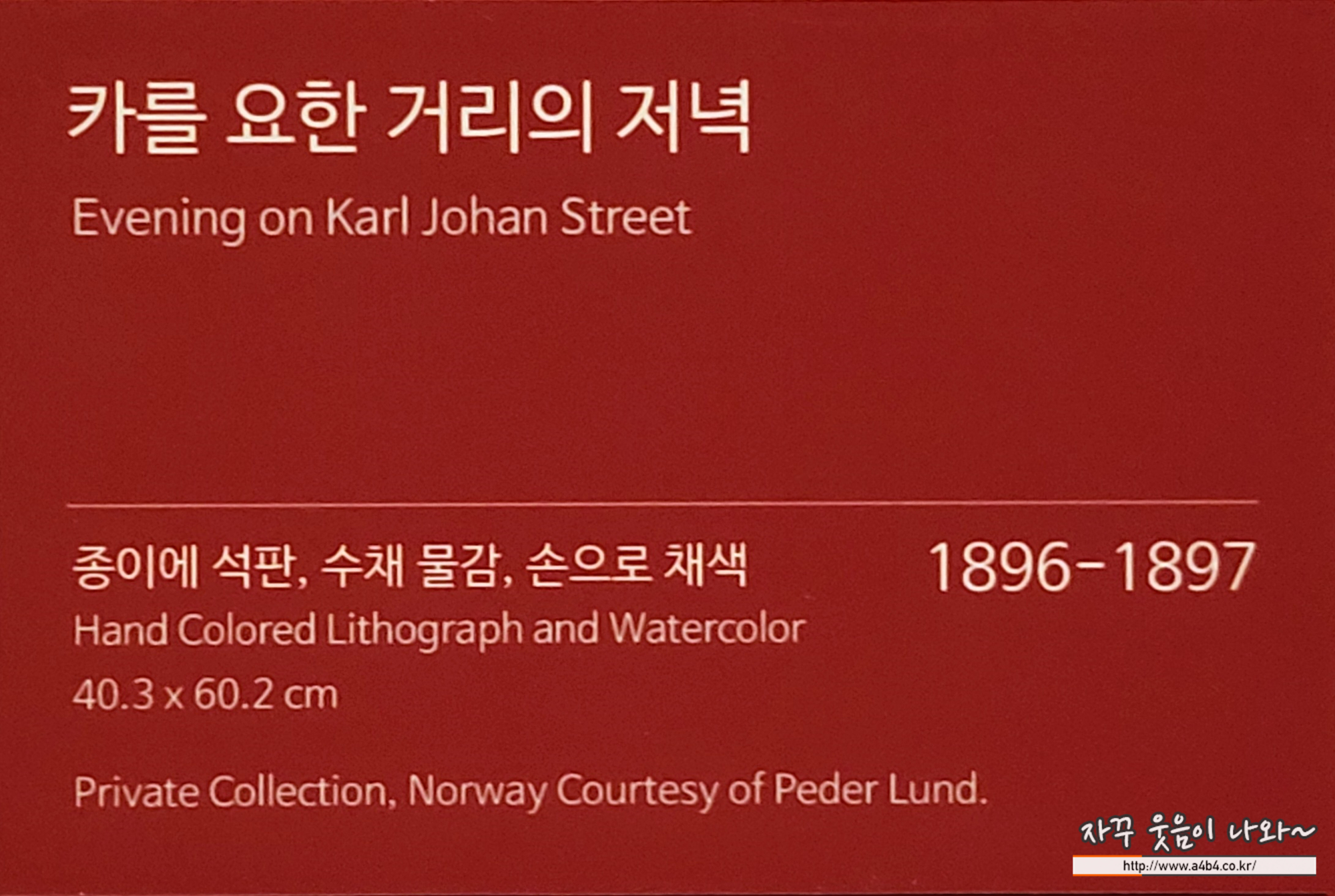 "카를 요한 거리의 저녁'은 일상적인 거리 풍경을 판화로 묘사한 작품입니다. 석판화 위에 수채 물감으로 채색한 이 작품은 개 방적인 붓질과 역동적인 선이 특징입니다. 작품의 배경이 되는 카를 요한 거리는 노르웨이의 수도 오슬로 중심부를 가로지르는 최대의 번화가입니다. 이 작품에는 신경 증적이고 불안한 사람들이 삶의 의미를 찾아 정처 없이 헤매는 모습이 담겨있습니다.