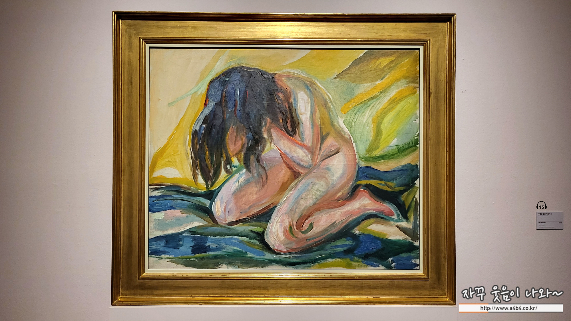 1902년부터 그의 사망 직전까지 뭉크는 스튜디오에서 인물 누드화를 다수 제작했습니다. 노르웨이로 돌아온 1909년 부터 는 동거인부터 가정부까지 많은 모델을 정기적으로 고용해 작품활동에 매진했습니다. 뭉크는 모델과의 신뢰와 개인적인 유대 를 쌓는 것을 중요하게 생각했는데요, 모델의 개인적인 특성을 작품으로 표현하고 싶어했기 때문입니다. 이런 뱅크의 특징 은 초상화에서도 동일하게 적용됩니다. 인물을 그대로 옮기는 것에 그치지 않고, 대상이 되는 인물의 개인적인 특성과 감정 을 담고자 했습니다. 뭉크는 종종 '인간은 두려움과 고통을 느끼는 외로운 존재' 라는 것을 표현하기 위해 긴 머리를 늘어트린 여성 누드를 보여주 기도 했습니다. <무릎을 끓은 여성 누드>는 그 연장선에 있는 작품입니다.