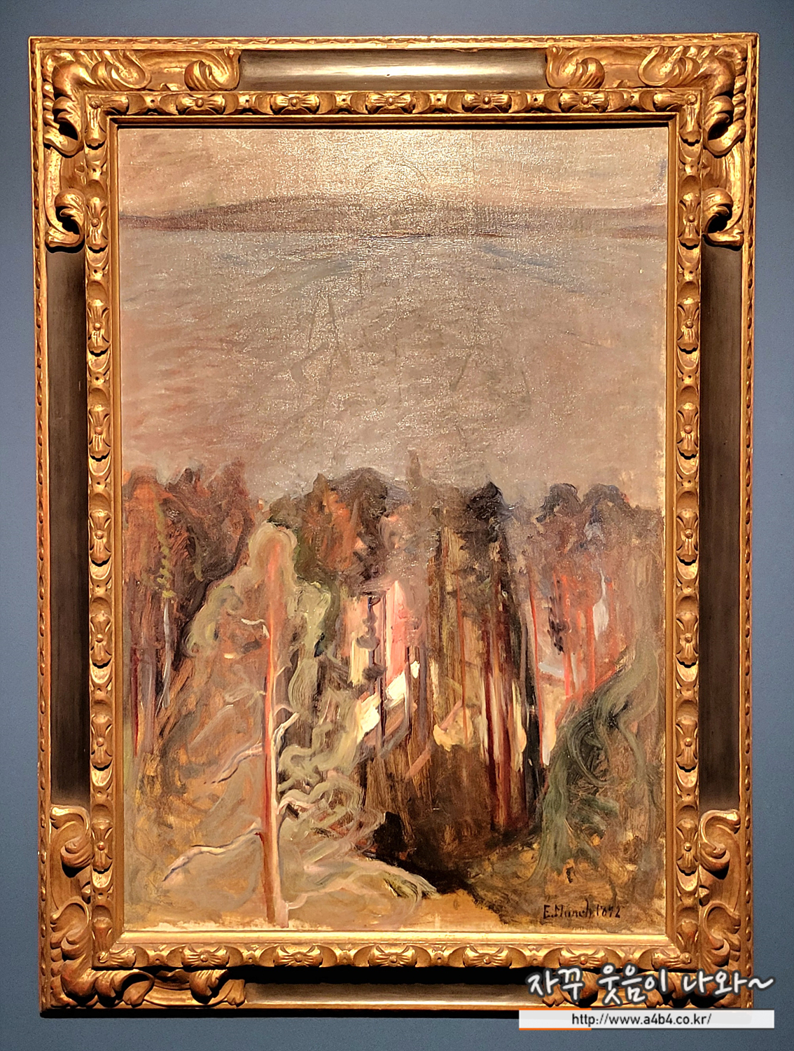 뭉크의 작품에서 풍경은 단순한 배경 이상의 의미를 지닙니다. 마치 주변 환경이 그 안에 있는 사람들의 내면의 풍경을 흡수 해 우울함, 그리움, 삶에 대한 열정과 낙관주의, 또는 불안으로 가득 찬 비명을 자연을 통해 내뱉는 것처럼 느껴집니다. 그 의 작품 속 풍경이 뭉크 자신의 경험과 감정을 듬뿍 머금고 있기 때문입니다. 뭉크는 숲, 해안, 바다, 피오르 등 자신이 머물던 장소들과 계절에 따른 폭풍우나 눈이 온 풍경을 많이 남겼습니다.