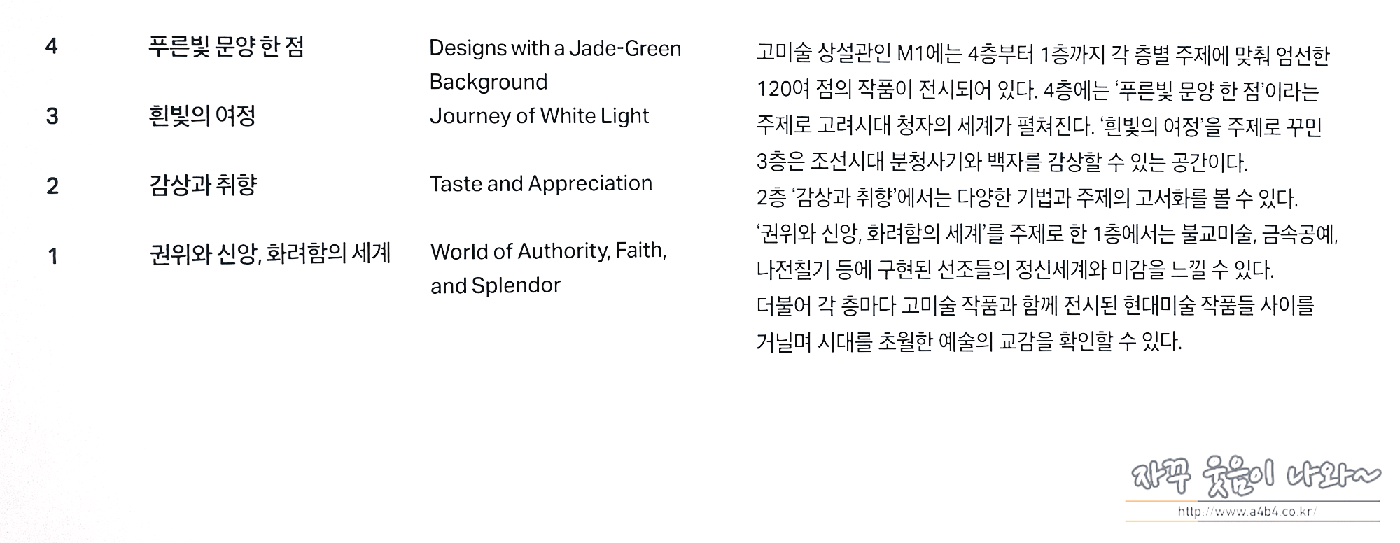 오늘은 리움미술관 상설 전시관 4층과 3층의 작품을 만나보았습니다. 다음 포스팅에서는 2층과 1층의 서화와 불교미술 수개합니다.