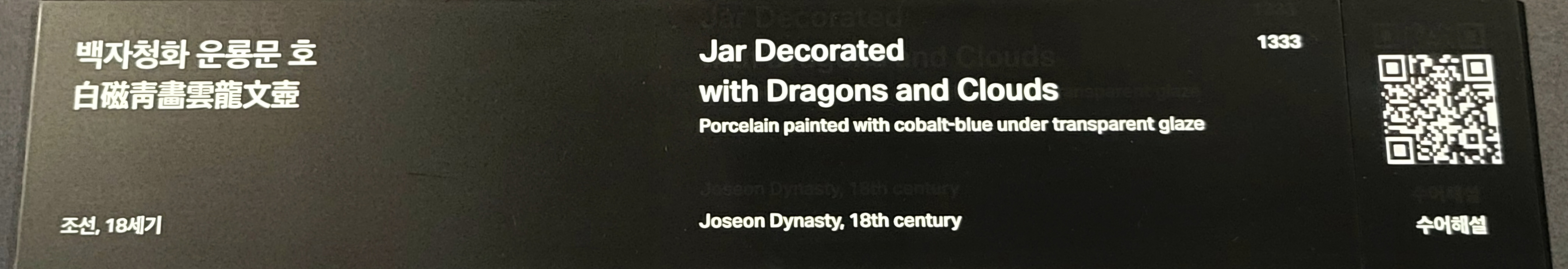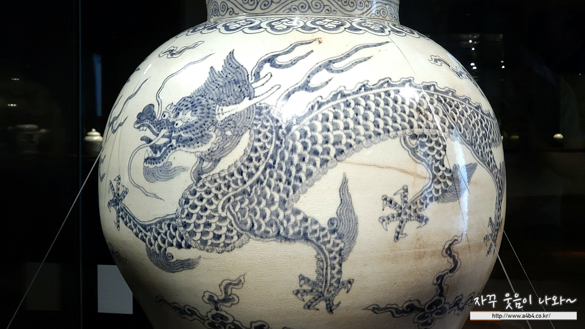 이 호는 위쪽과 아래쪽에 보조적인 문양은 생략하고, 몸체 중앙의 용과 구름에만 집중했기 때문에 힘찬 기운이 더욱 잘 전달됩니다. 부분부분 짙은 동 안료를 활용해 채색 효과를 냈는데, 이러한 변화 또한 왕실백자와는 다른 특징입니다.