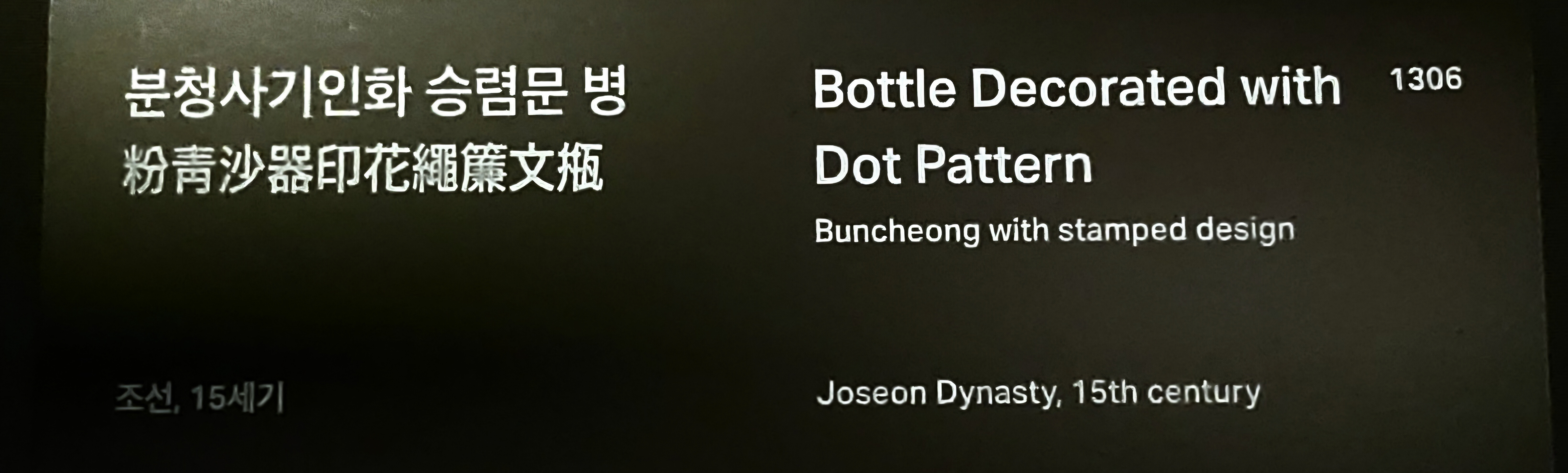 가늘고 긴 목과 펑퍼짐한 하부를 동시에 갖고 있는 병이다. 몸체 외면은 도장을 찍는 기법으로 새끼줄과 같은 문양을 빽빽이 시문하였는데, 도장의 세로 길이에 따라 자연스럽게 일곱 개의 문양대가 형성되었다. 목 아래의 첫 문양대는 가로선을 그어 명확히 구분하였고, 목은 문양없이 비워놓아 분위기를 단숨에 전환하는 점이 매력적이다. 인화 분청사기가 널리 제작되던 15세기 전중반의 예를 잘 알 수 있는 작품이다.