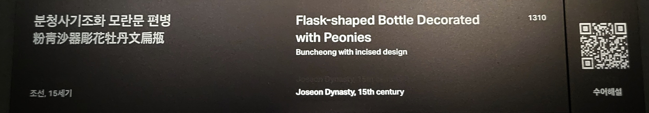 고려 상감청자의 전통을 잇는 분청사기 매병입니다. 분청사기는 ‘분장을 한 회청색 사기’라는 의미이지만 조선 초기 상감분청사기는 이 작품처럼 분장을 하지 않아 사실상 청자에 가깝습니다. 매병 중앙에 과감하게 새겨 넣은 용은 몸을 힘차게 휘감으며 왼쪽을 향하고 있고, 얼굴은 흑백의 선으로 간결하게 표현해 내고 있습니다. 이러한 용의 표현은 14세기 전반 고려청자 때부터 이어져 온 것으로, 그 연원을 더 거슬러 올라가면 원나라에서 새롭게 제작되기 시작한 청화백자로까지 이어집니다.