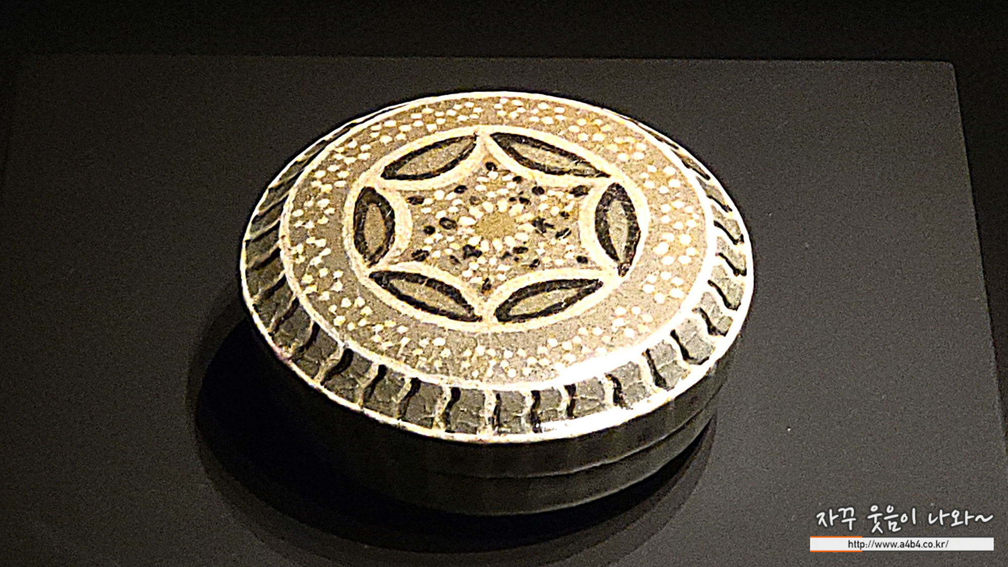 용기와 뚜껑이 같은 크기로 꼭 맞고, 납작한 모양을 하고 있는 종류를 합이라고 부른다. 화장용구로 사용되었는데, 내용물이 함께 전하는 경우는 드물다. 이 합은 평면과 사선, 직선이 교차하며 만들어 내는 단정한 형태 뿐만 아니라 동심원과 별 모양과 같은 독특한 문양 구성 또한 돋보이는 작품이다. 백색과 흑색을 내는 흙 물로 장식 공간을 만들고, 그 사이를 국화와 점선문으로 마무리하였다. 여러 점과 선이 한데 모여 만들어내는 일체감이 특별하게 다가오는 수작이다.