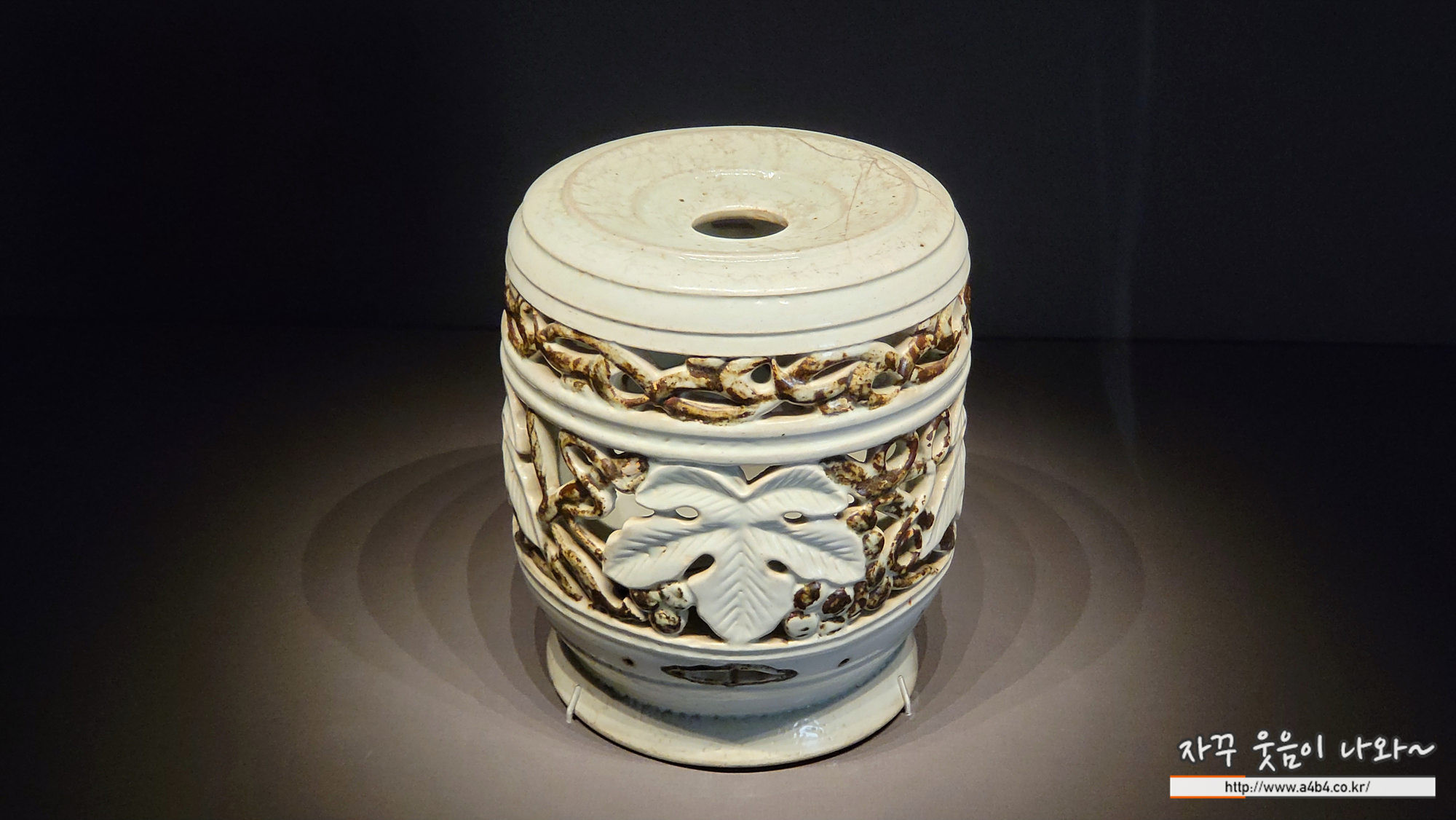 조선 문인들은 식물을 화분에 심어 가까이에 두고 감상하며, 식물이 상징하는 고매한 인품과 학자적 경지를 닮고자 노력했다. 이 백자는 화분을 받치는 용도로 사용된 것으로 몸체 전면에 베풀어진 화려한 투각 기법이 빼어나다. 몸체 중앙에는 네 송이의 포도가 잎, 덩굴과 함께 투각 되었다. 포도와 덩굴을 철안료로 채색하여 잎이 더욱 밝은 기운으로 다가오는 것이 특징이다.