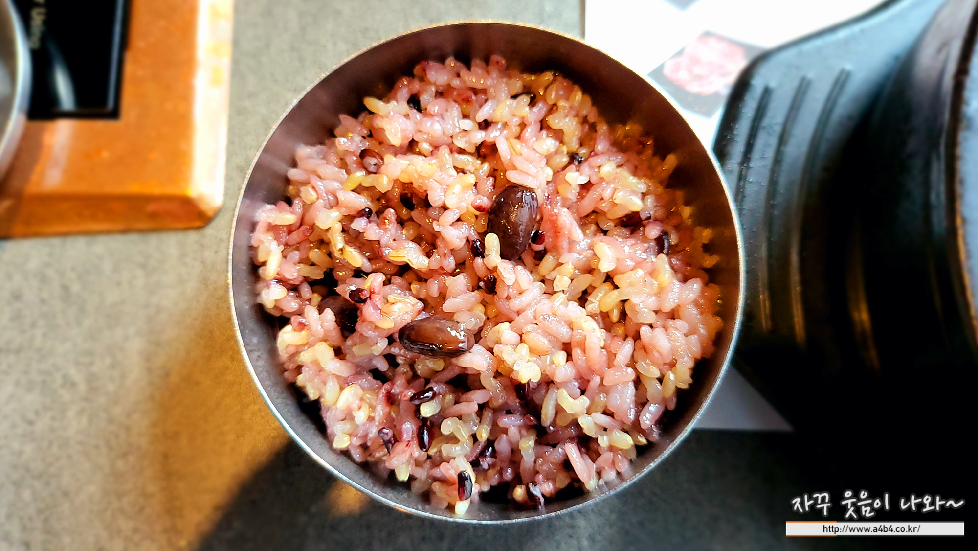 가격은 15,000원 입니다. 1천원 추가하면 사진과 같이 발아현미밥이 나오고요. 잡곡밥 같은 느낌인데, 제가 좋아하는 밥이네요. 콩, 흑미들이...