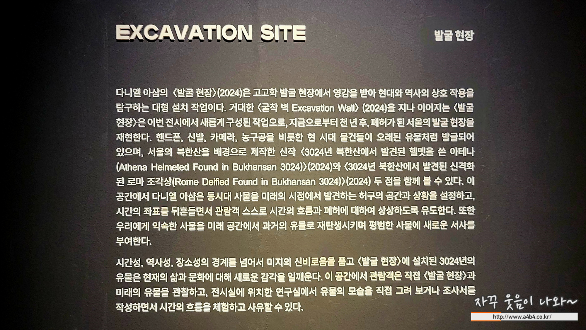 서울의 북한산을 배경으로 제작한 신작 <3024년 북한산에서 발견된 헬멧을 쓴 아테나 (Athena Helmeted Found in Bukhansan 3024)>(2024)와 <3024년 북한산에서 발견된 신격화 된 로마 조각상(Rome Deified Found in Bukhansan 3024)>(2024)두 점을 함께 볼 수 있다. 다니엘 아샴이 상상하는 천 년 후 3024년 서울의 모습을 보여주고 있는 두 회화작품은 동시대 사물을 미래의 시점에서 발견하는 허구의 공간과 상황을 설정하고, 시간의 좌표를 뒤흔들면서 관람객 스스로 시간의 흐름과 폐허에 대하여 상상하도록 유도합니다.