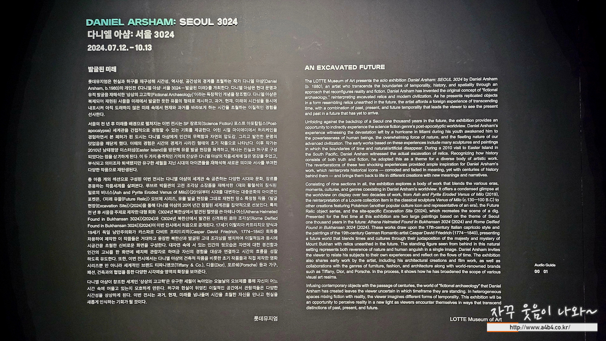 롯데뮤지엄에서 열리고 있는 이번 전시회는 현실과 허구를 재구성해 시간성, 역사성, 공간성의 경계를 초월하는 작가 다니엘 아삼(Danlel Arsham, b. 1980)의 개인전 '다니엘 아샴: 서울 3024- 발굴된 미래'입니다.