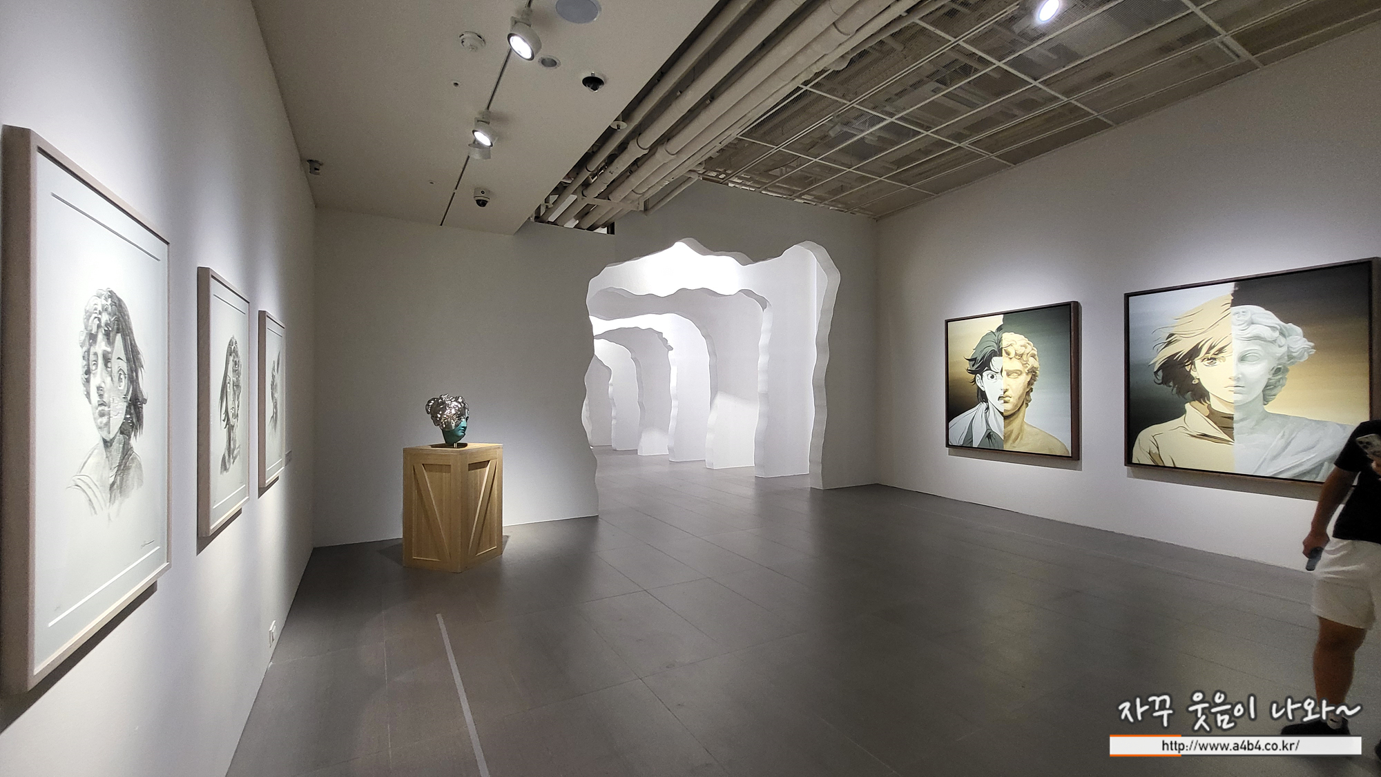 이번 공간에서는 고전 조각상과 애니메이션 캐릭터의 얼굴을 결합하여 한 화면에 배치한 '분절된 아이돌(Fractured ldols)' 시리즈를 보여준다.