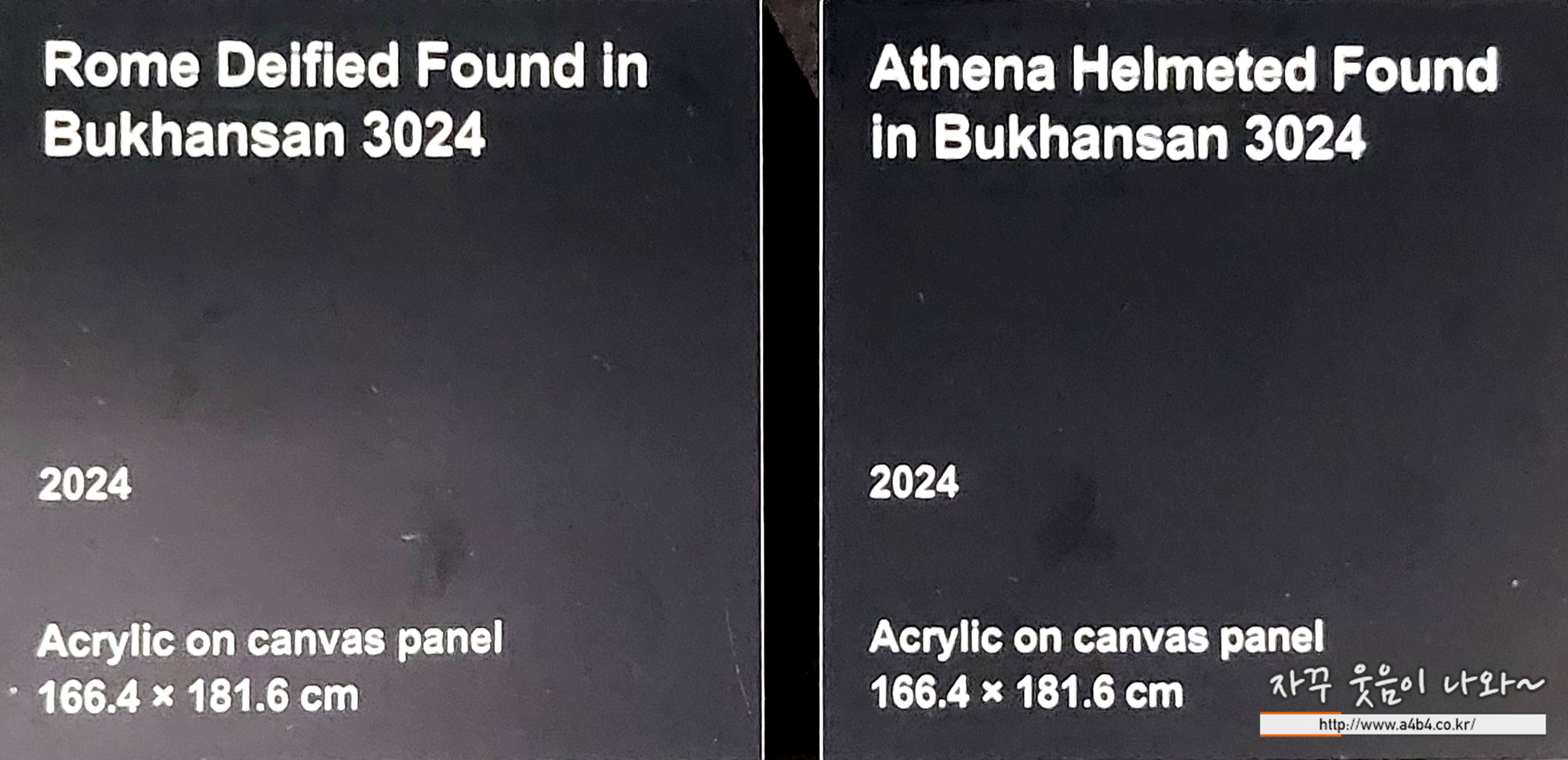 특히 천 년 후서울을 주제로 제작한 대형 회화 <3024년 북한산에서 발견된 헬멧을 쓴 아테나 여신(Athena Helmeted Found in Bukhansan 3024)>(2024)과 <3024년 북한산에서 발견된 신격화된 로마 조각상(Rome Deifed Found in Bukhansan 3024)>2024)이 이번 전시에서 처음으로 공개된다. 17세기 이탈리아 카프리치오 양식과 19세기 독일 낭만주의화가 카스파르 다비트 프리드리히(Caspar David Friedrich, 1774-1840) 회화를 차용하여 제작한 이 작품들은 거대하고 웅장한 북한산과 발굴된 고대 조각상을 병치하여 이질적임과 동시에 시공간을 초월한 신비로운 화면을 구성한다.