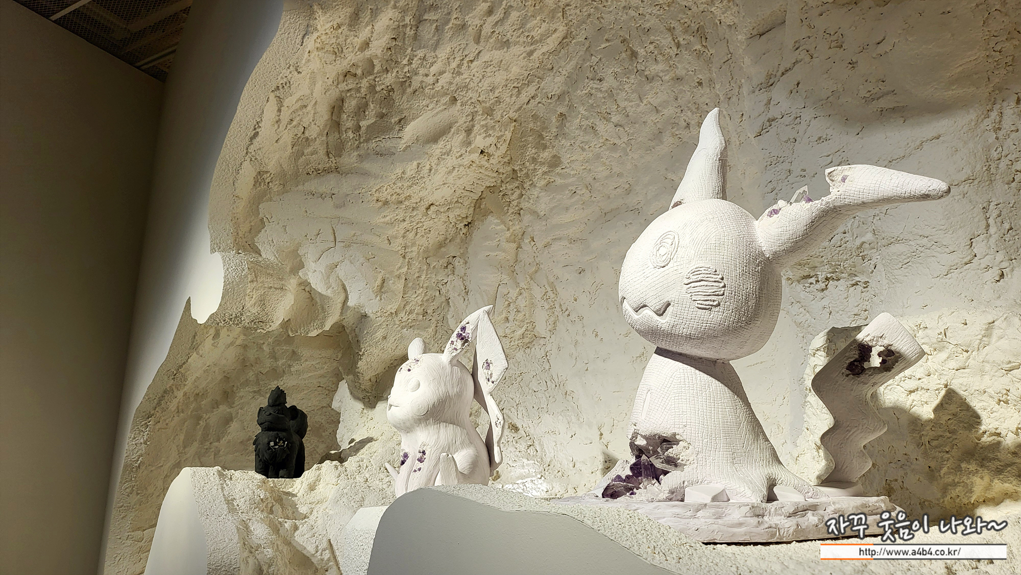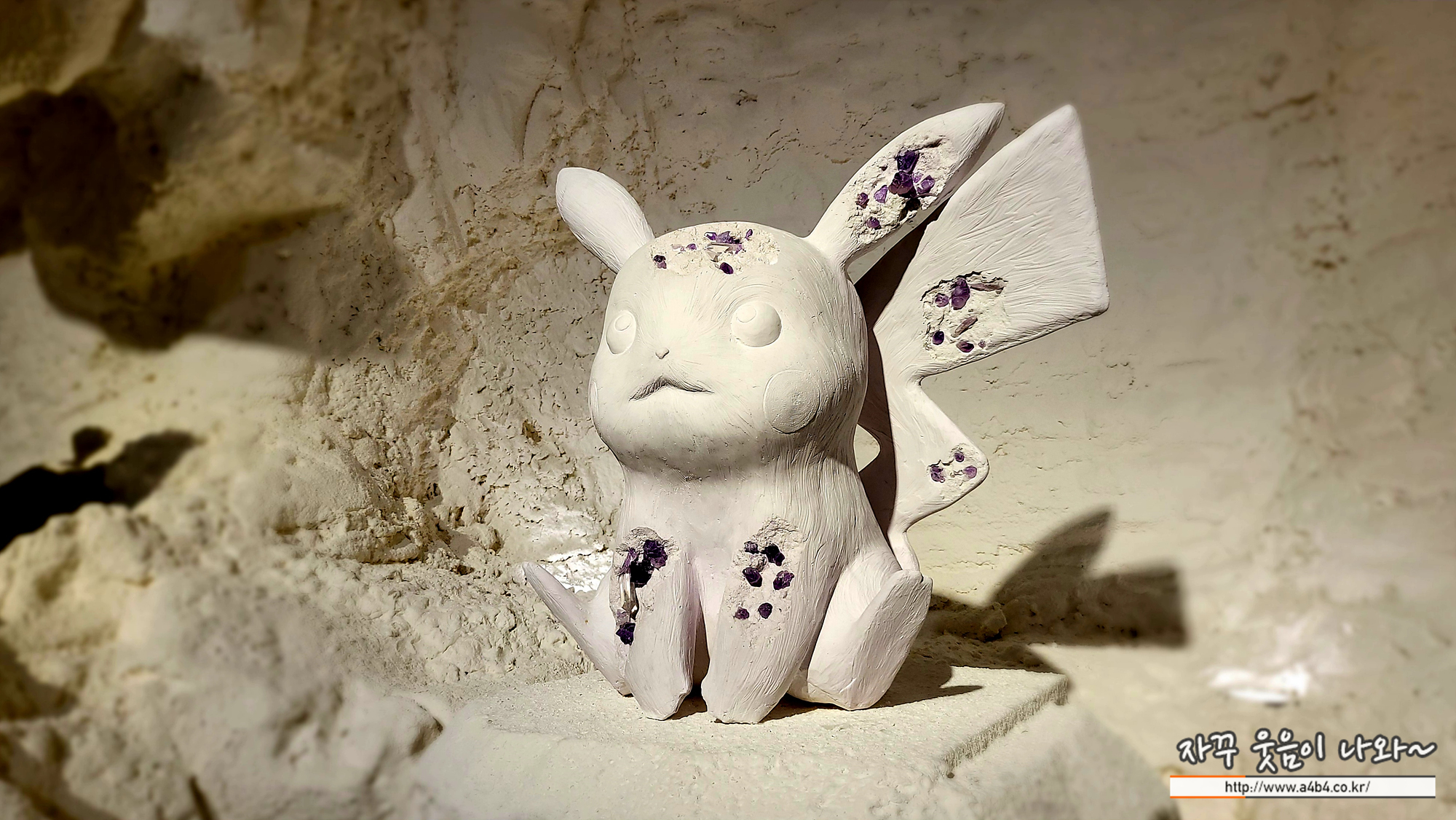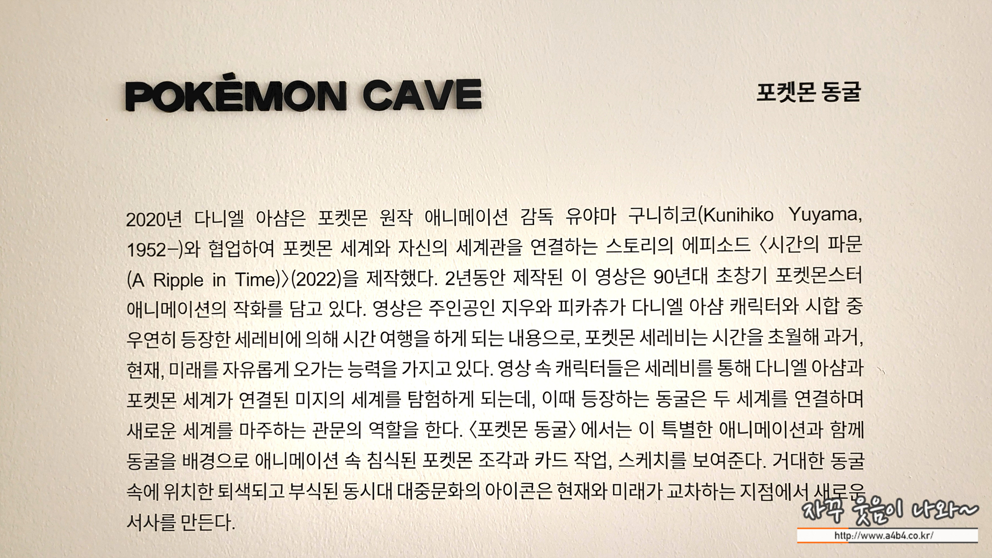 영상 속 캐릭터들은 세레비를 통해 다니엘 아샴과 포켓몬 세계가 연결된 미지의 세계를 탐험하게 되는데, 이때 등장하는 동굴은 두 세계를 연결하며 새로운 세계를 마주하는 관문의 역할을 한다. <포켓몬 동굴> 에서는 이 특별한 애니메이션과 함께 동굴을 배경으로 애니메이션 속 침식된 포켓몬 조각과 카드 작업, 스케치를 보여준다. 거대한 동굴 속에 위치한 퇴색되고 부식된 동시대 대중문화의 아이콘은 현재와 미래가 교차하는 지점에서 새로운 서사를 만든다