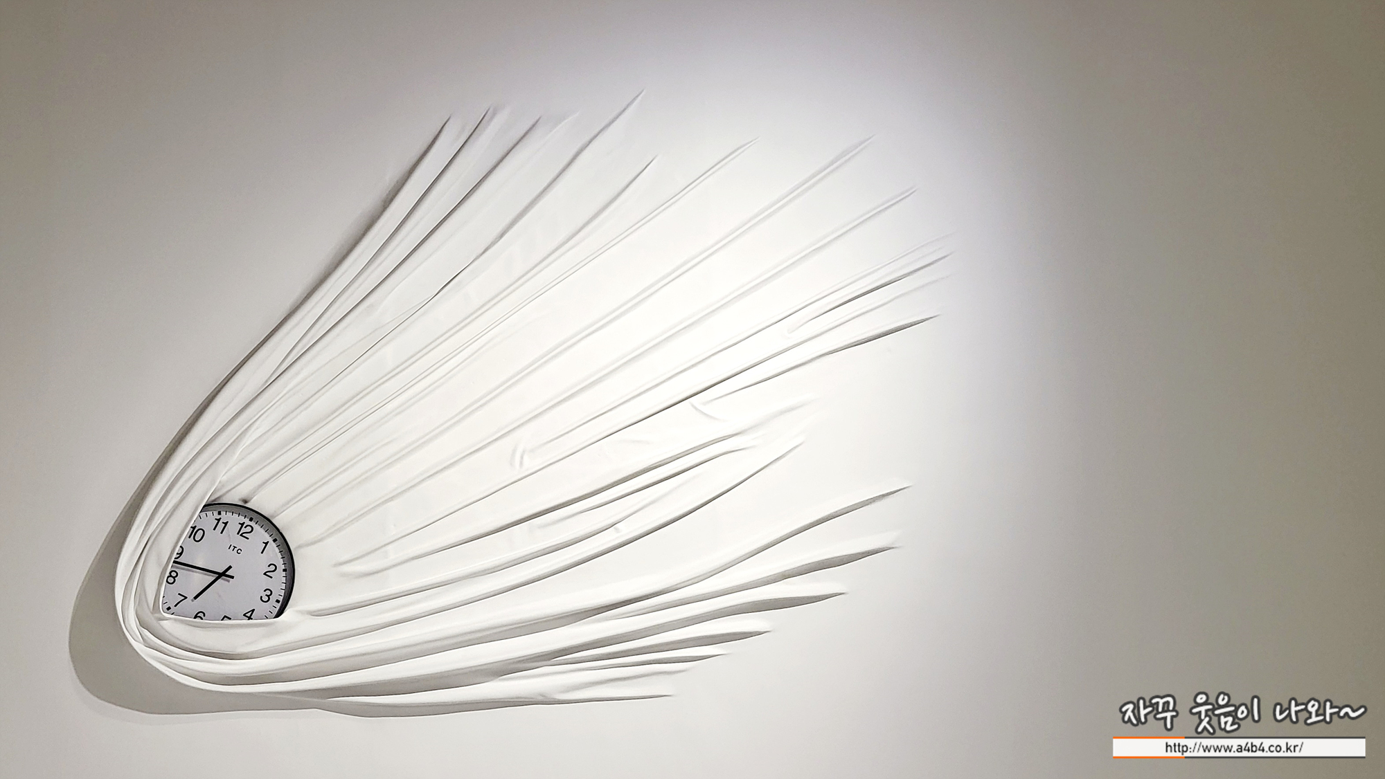 혜성처럼 하늘에서 떨어지는 듯한 시계와 그 궤적이 하얀 벽에 잔물결의 형상을 남깁니다. '추락하는 시계'는 다니엘 아삼 작업의 중심 주제인 시간을 직접적으로 시각화하는 대표적인 작품 중 하나로, 시계가 중력의 영향을 받아 아래로 떨어지는 순간을 포착하며, 시간성의 상실을 은유합니다.