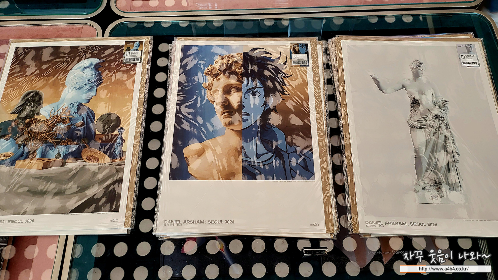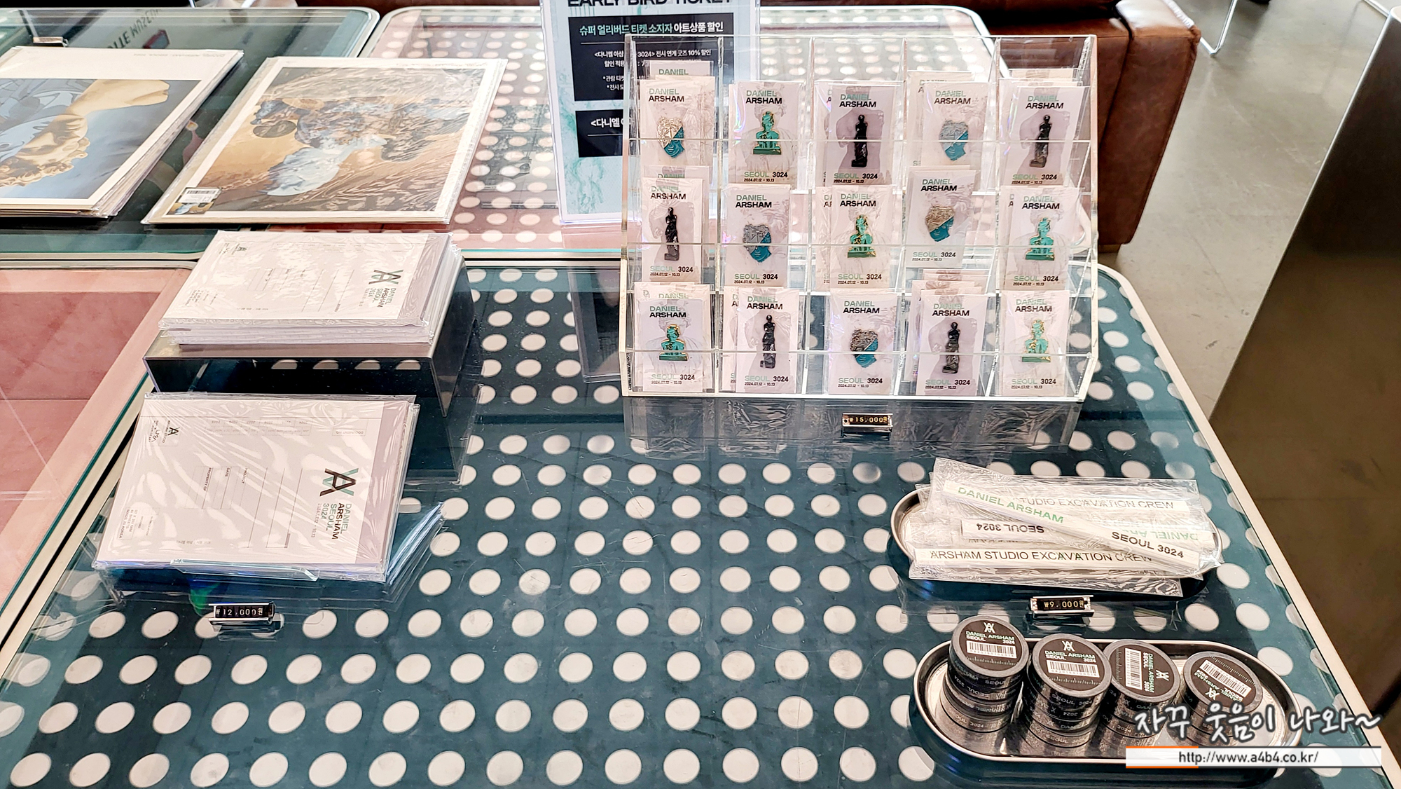 다니엘 아샴: 서울 3024 ㅡ 발굴된 미래 전시회 관람이 끝나면 입구 반대편에 아트샵과 카페가 위치해 있습니다. 포스터나 엽서 등 기본적인 기념품이 준비되어 있고요. 가격도 아트샵 상품 고려하면 합리적인 가격입니다.