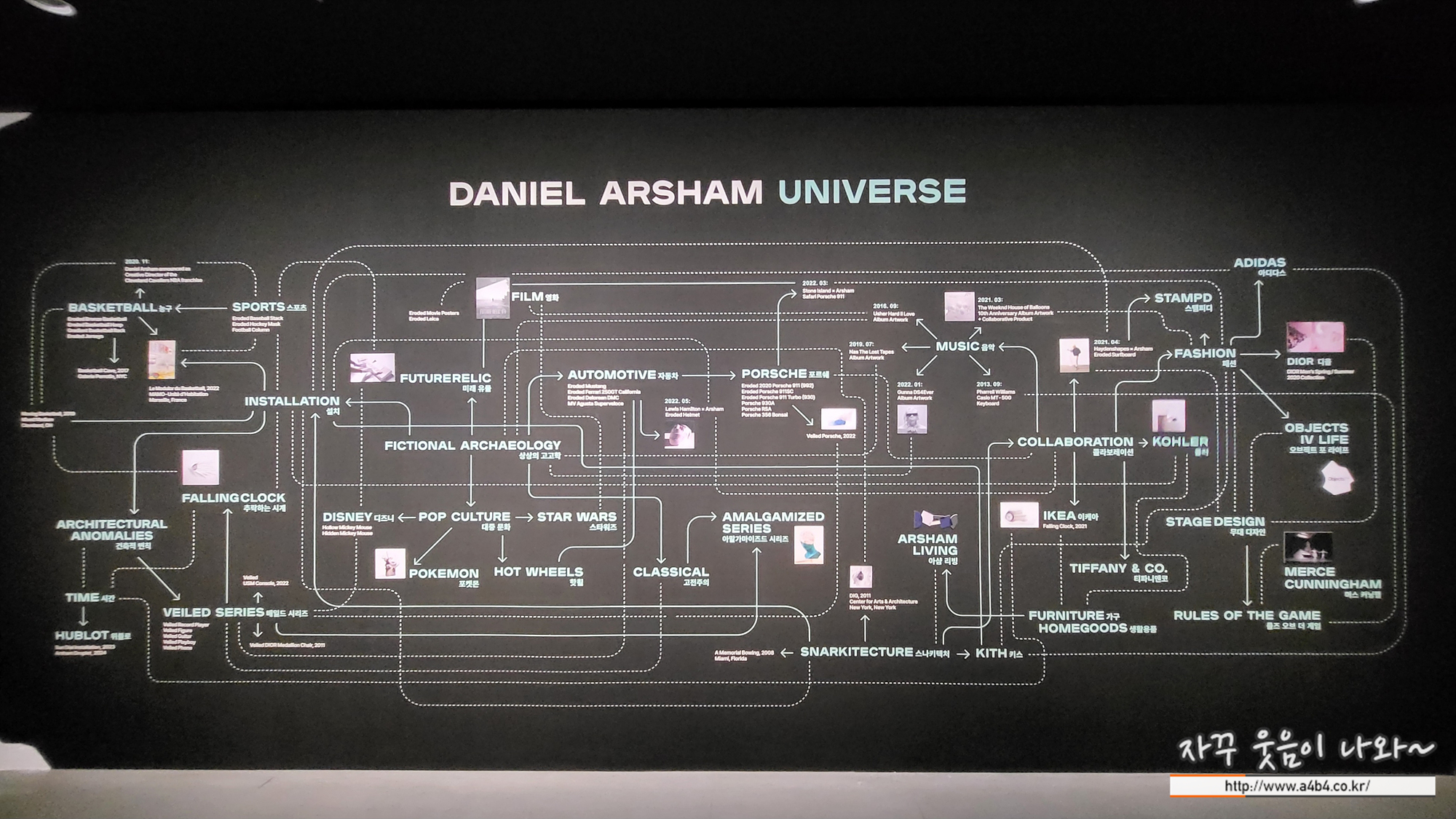 지도의 좌측은 작품 세계에 중심이 되는 개념을 중점으로 다룹니다. 지도의 우측은 협업 작업을 중심으로 구성되어 있습니다. 건축 디자인 사무소 스나키텍쳐, 패션 브랜드 오브젝트 포 라이프, 가구 컬렉션 오브젝트 포 리빙 등 예술뿐만 아니라 여러 영역을 가로지르며 자유롭게 뻗어 나가는 다니엘 아샴의 예술적 확장과 실천이 드러나 있습니다.