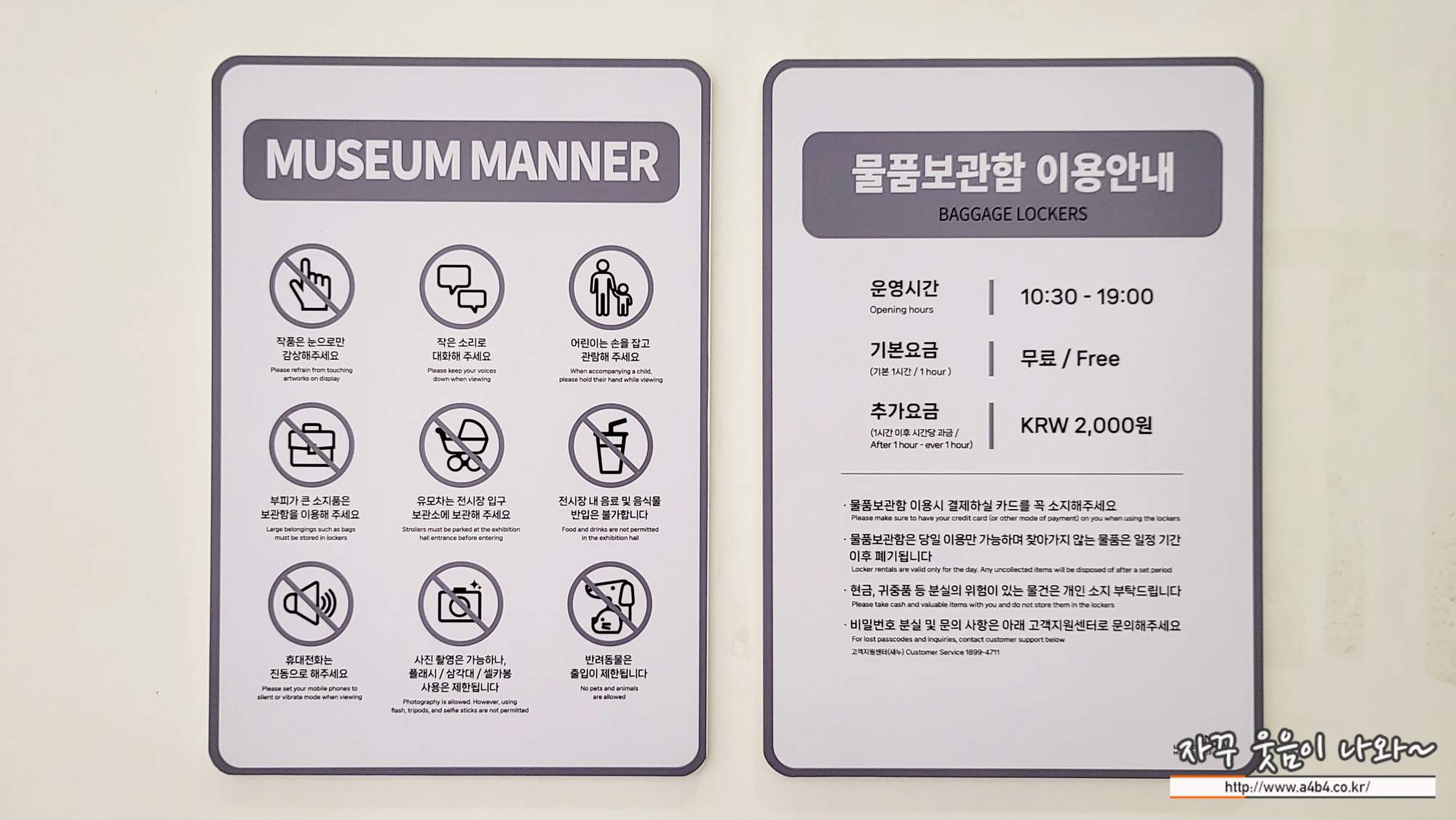 백팩이나 큰 가방, 유모차는 반입불가로 전시장 티켓박스 옆에 있는 물품 보관함 이용하시면 됩니다. 첫 한 시간은 무료이며 이후 한 시간에 2,000원 보관료가 발생합니다.