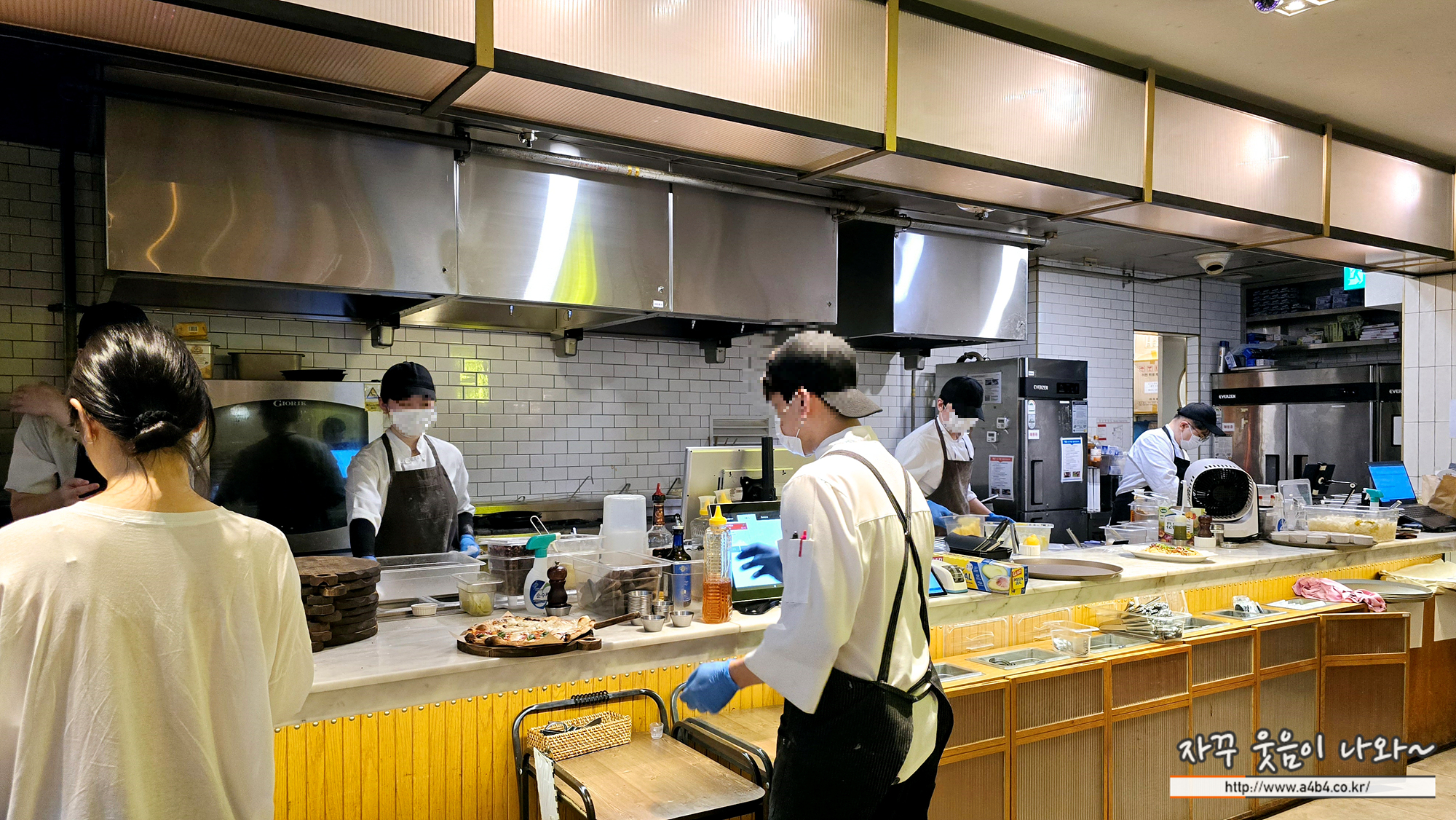 더플레이스 송파 매장 입구에는 오픈된 주방이 위치해 있습니다. 저희는 12시 쯤 방문했는데, 주말에 T Day 프로모션이 있어서 그런지 정신없이 운영되고 있습니다. 정말로 쉴 틈 없다는 그 표현이 딱 맞는 상황이었고요. 실내도 한 두 테이블을 제외하고는 식사 손님들이 모두 있네요.