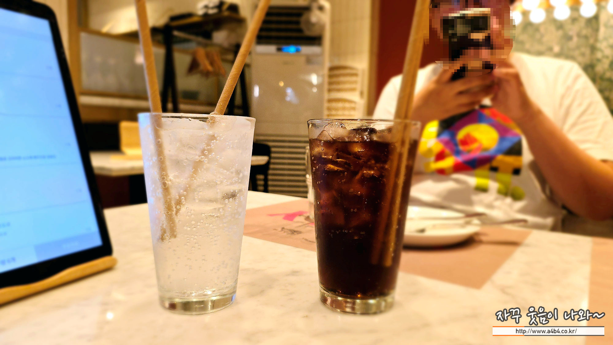 먼저 T day 쿠폰 소지자에게 무료 제공되는 탄산음료 두 잔 나옵니다. (콜라, 다이어트 콜라, 사이다 중 택 2)