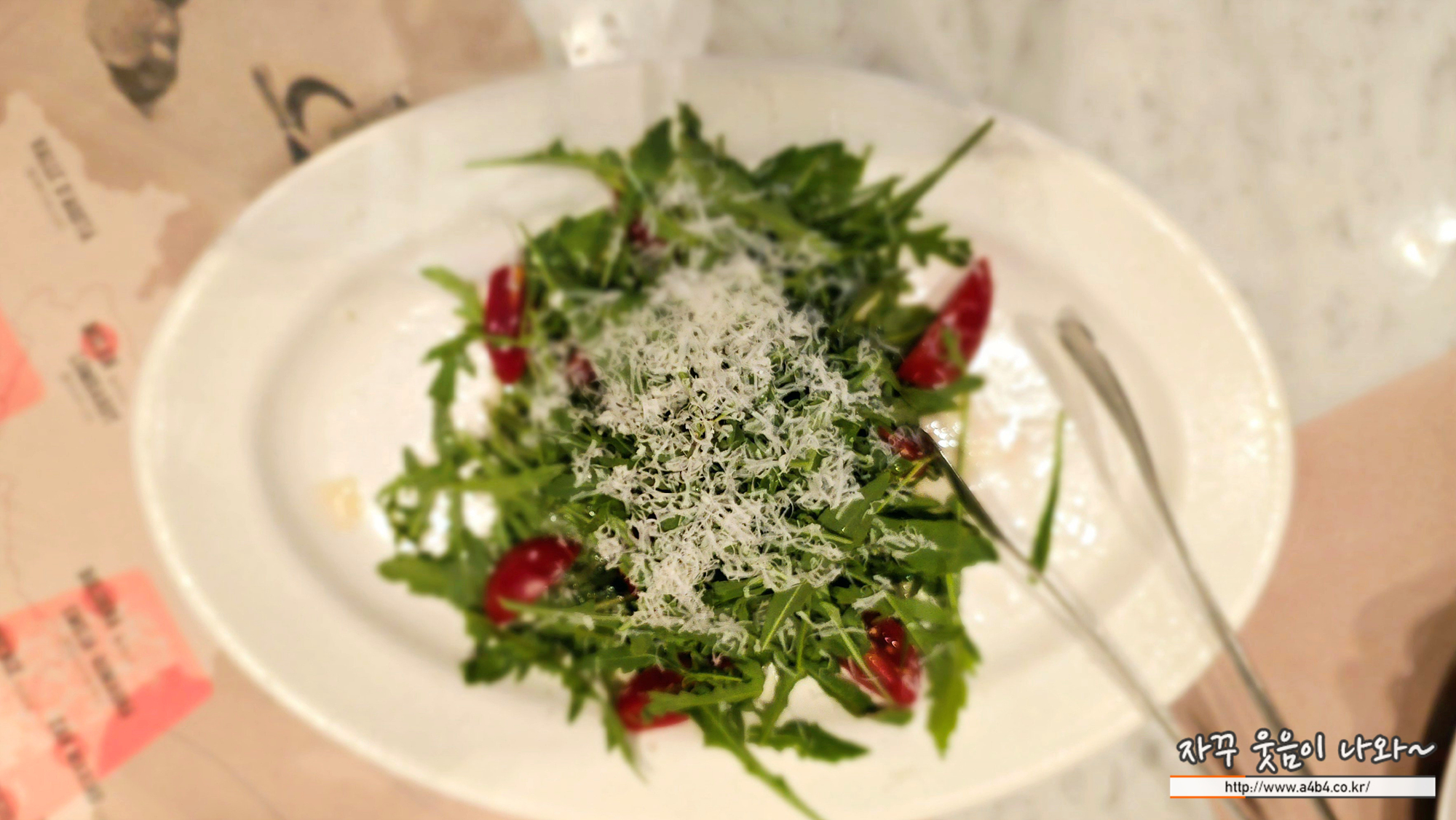 첫 서빙된 음식이 루꼴라 샐러드인데요. 양이 너무 적어서 실망했네요. 서빙받은 모양에서 손 안 대고 찍은사진 입니다.
