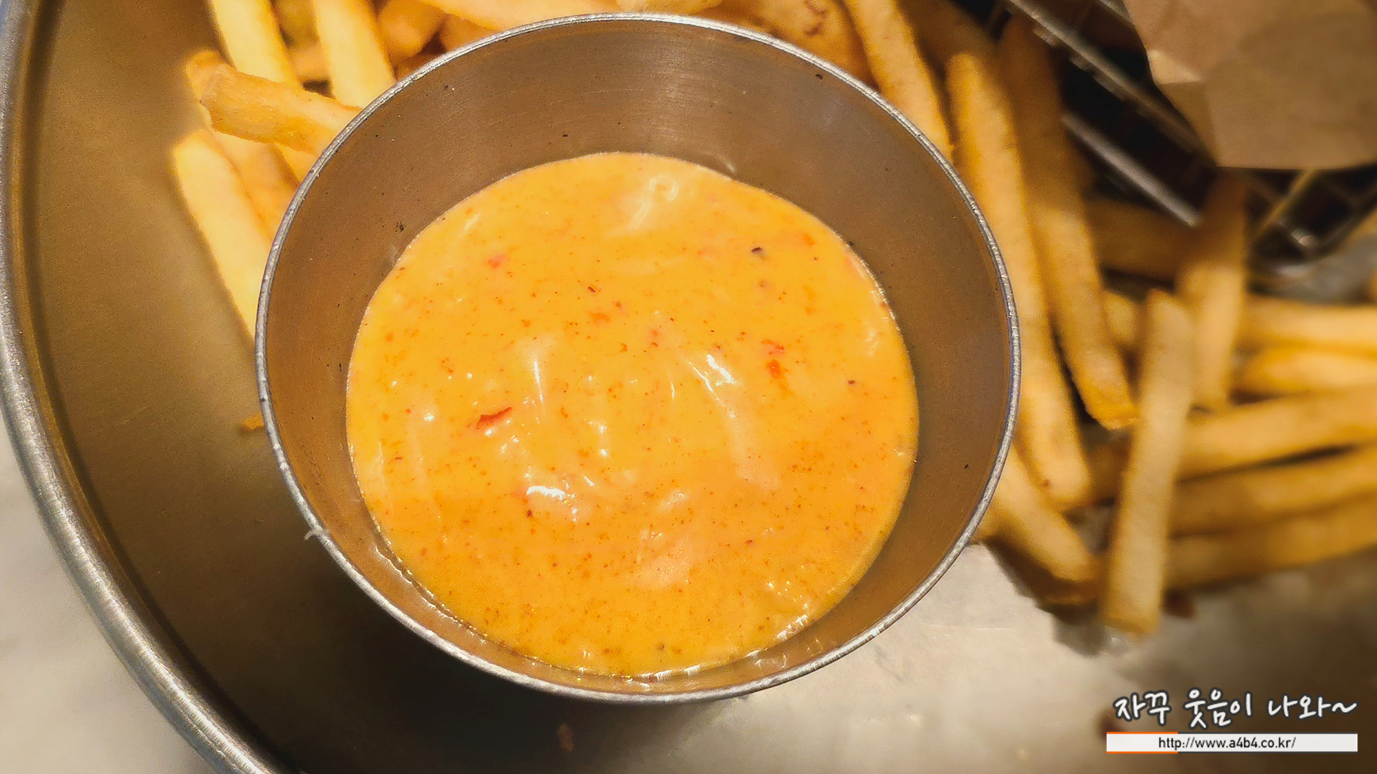 치즈가 얹어진 감자튀김은 조금만 더 통통했으면 식감이 더 좋았을 것 같은데. 다소 마른 감자는 아쉬웠네요.