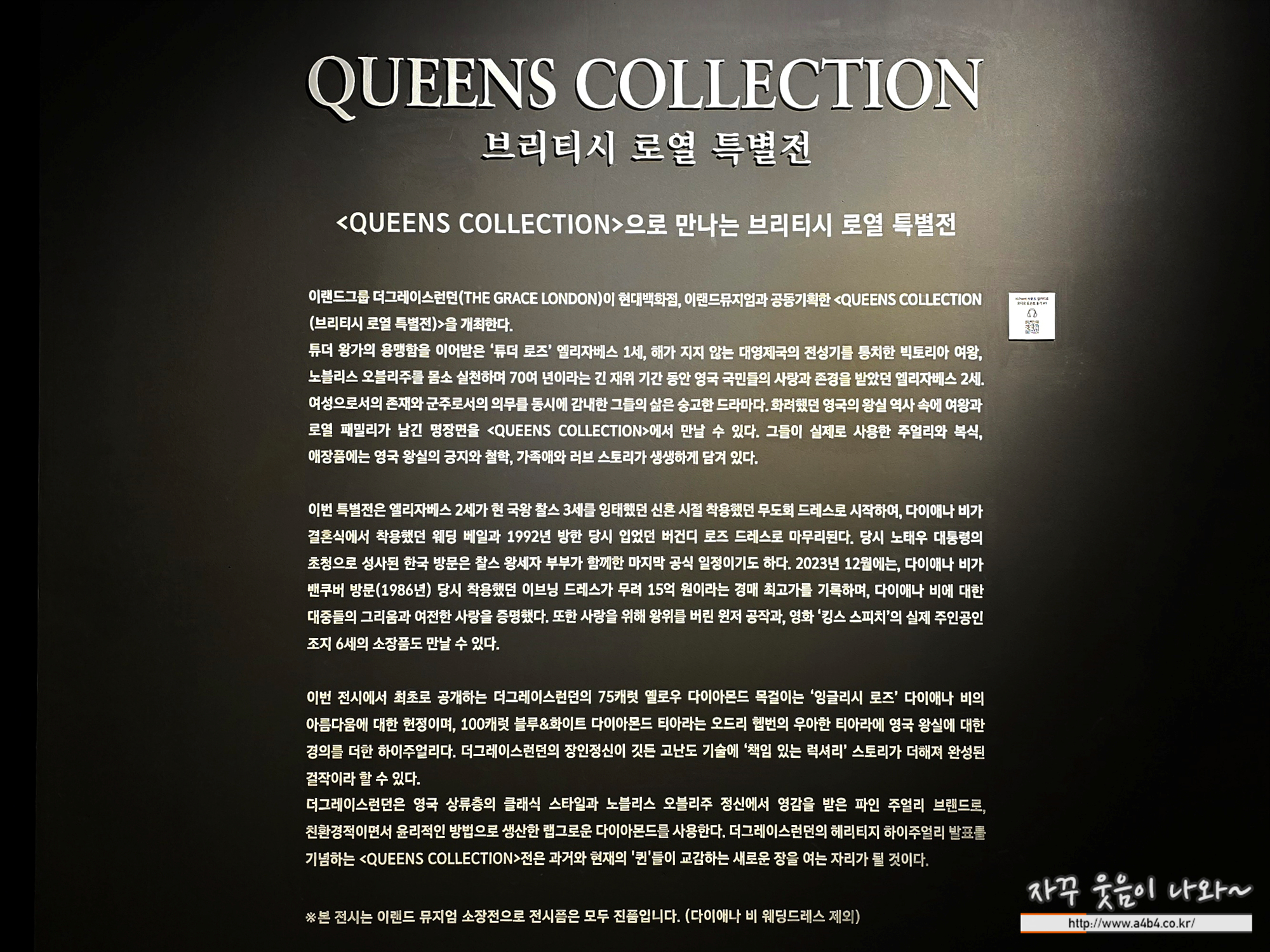 무역센터 현대백화점 10층 ‘퀸즈 컬렉션(QUEENS COLLECTION) 브리티시 로열 특별전’ 전시장 입장합니다.